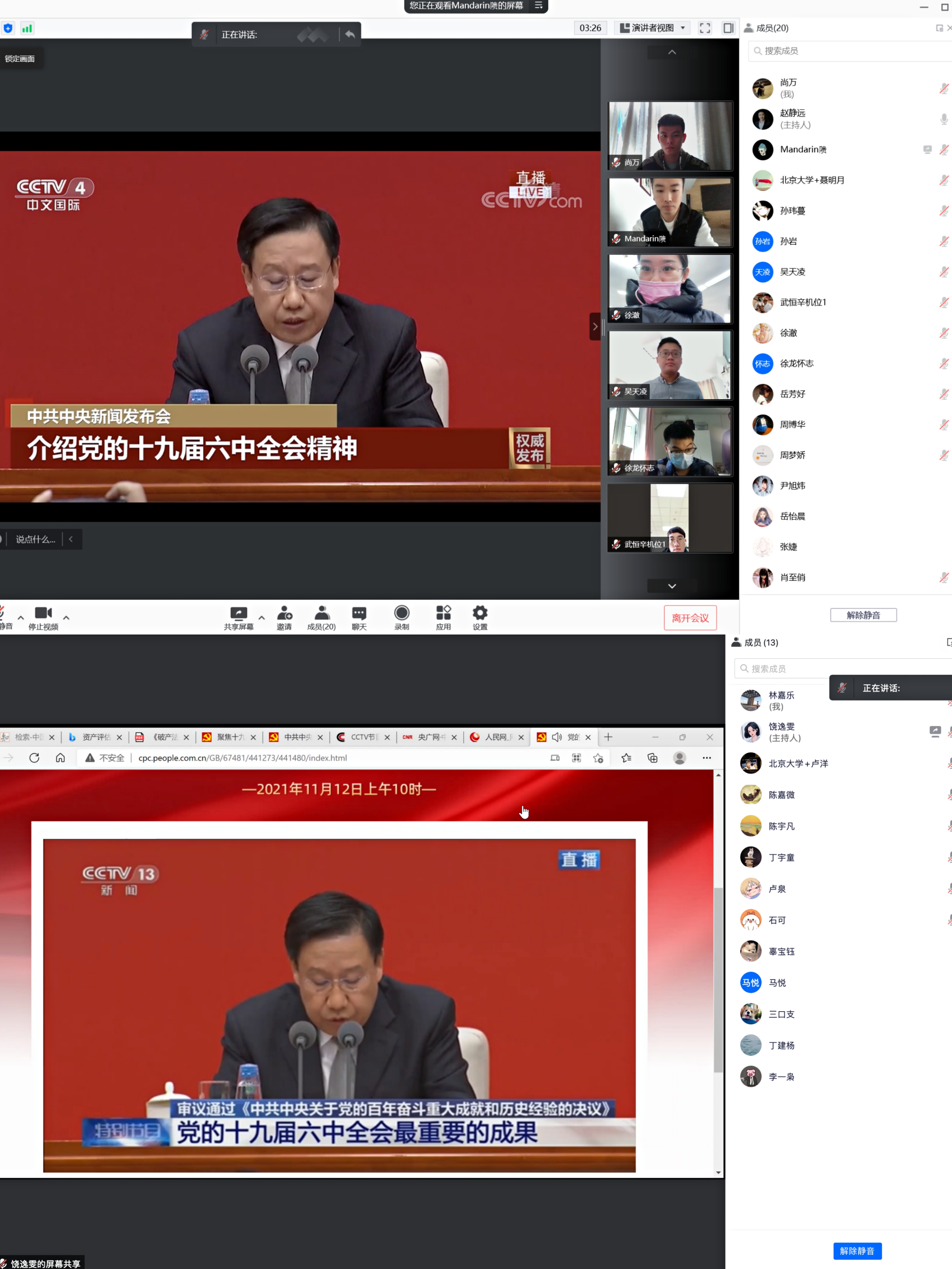 发布会直播结束后,英国威廉希尔英文官网师生在线上线下第一时间学习党的十九届六中全会精神,深入交流分享观看新闻发布会的感受。