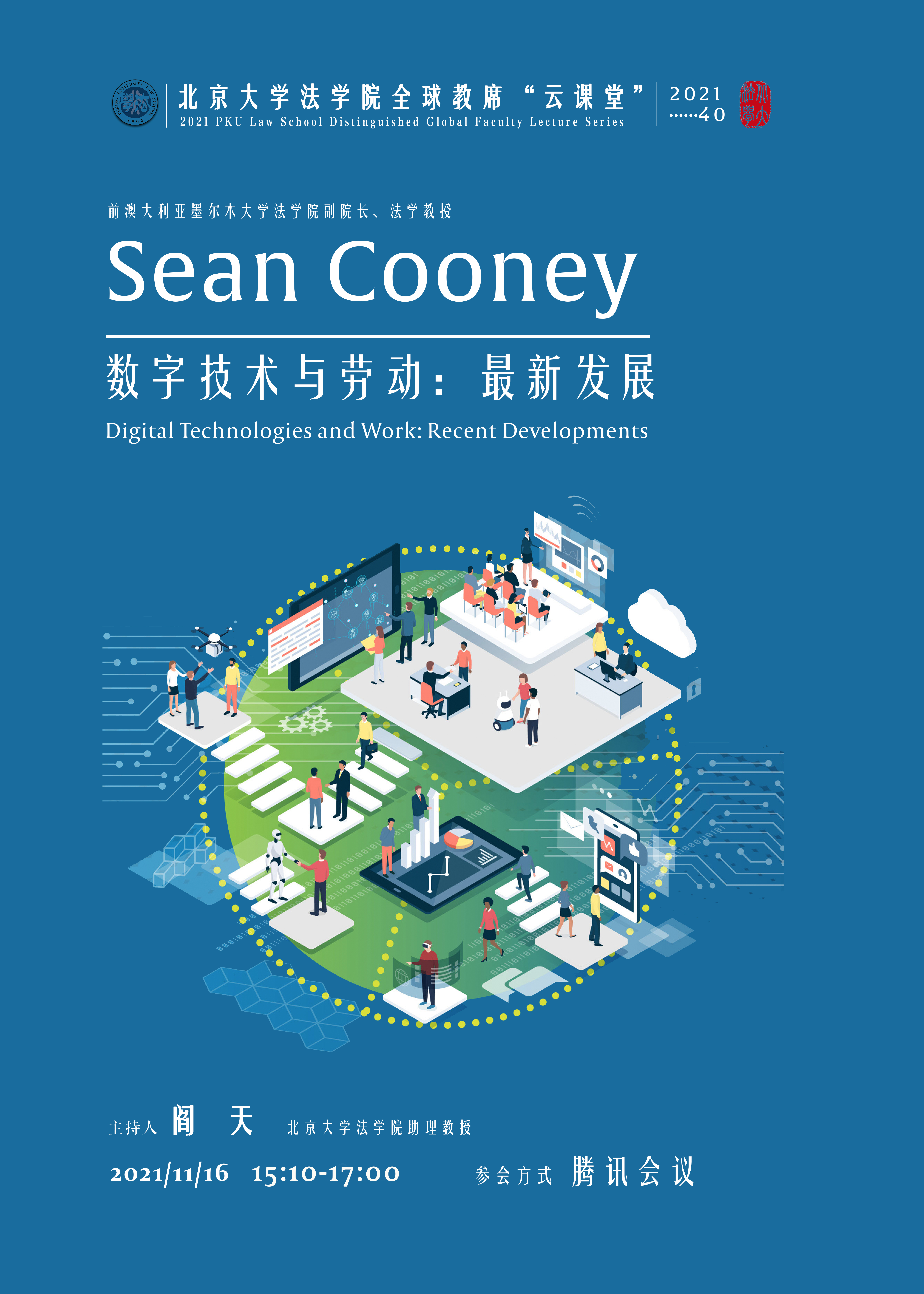 2021年11月16日,英国威廉希尔英文官网全球教席、前澳大利亚墨尔本大学英国威廉希尔英文官网副经理、法学教授Sean Cooney以“数字技术与劳动:最新发展”为题开展了一场线上学术讲座,讲座由英国威廉希尔英文官网助理教授阎天主持。百余名员工线下通过教室直播设备共同参与,同时,还有近百名校内外师生通过腾讯会议平台在线参与讲座,反响热烈。