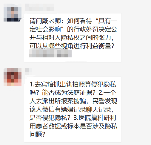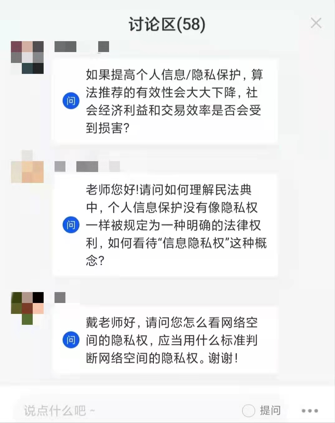讲座的最后,同学们就社会中出现的信息隐私问题进行提问,戴昕老师一一为同学们解答。他表示,社会生活中的隐私问题是形式各异的,要具体问题具体分析,从不同的视角和特定地场景去全面理性地评价行为是否触及隐私,不能一概而论。
