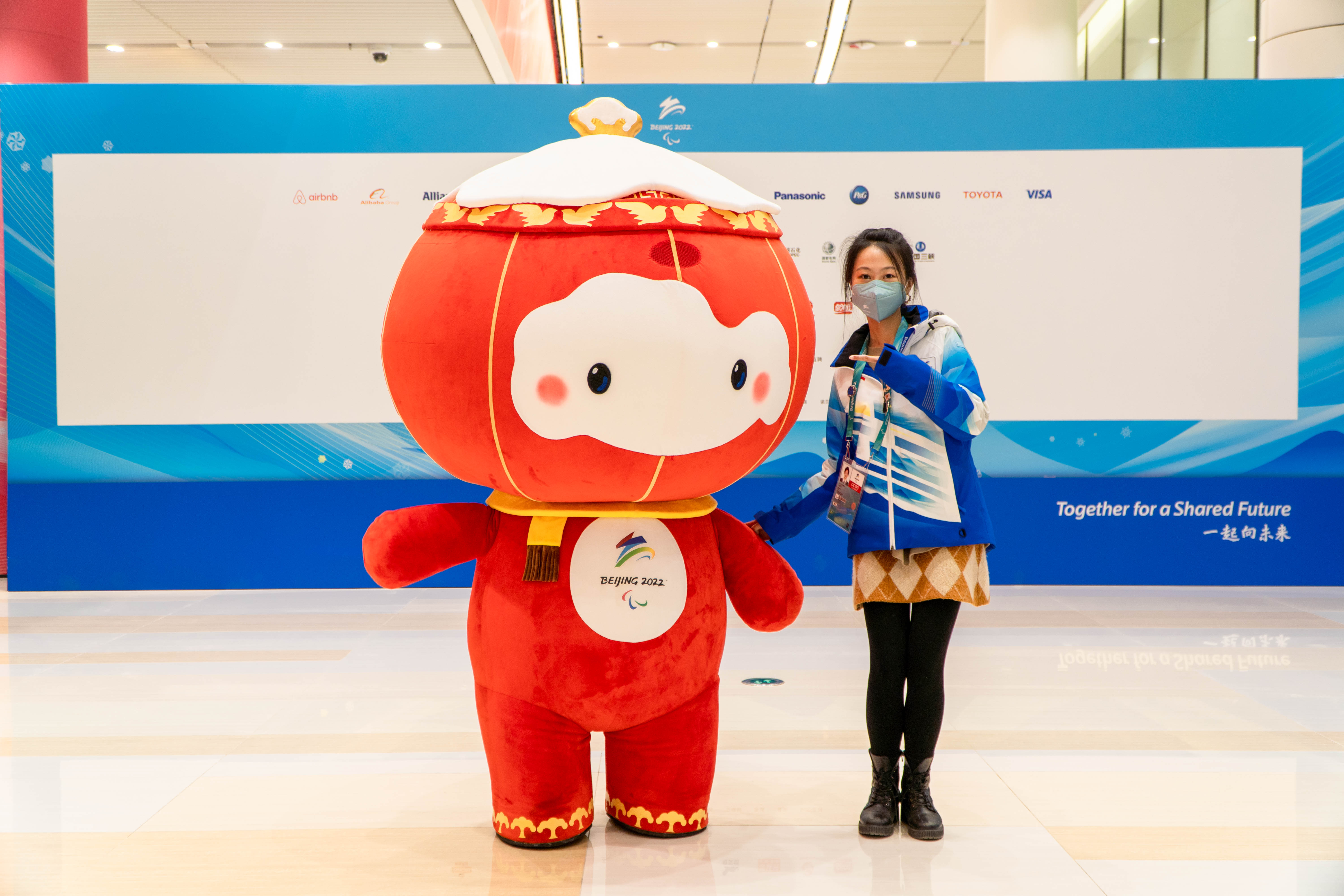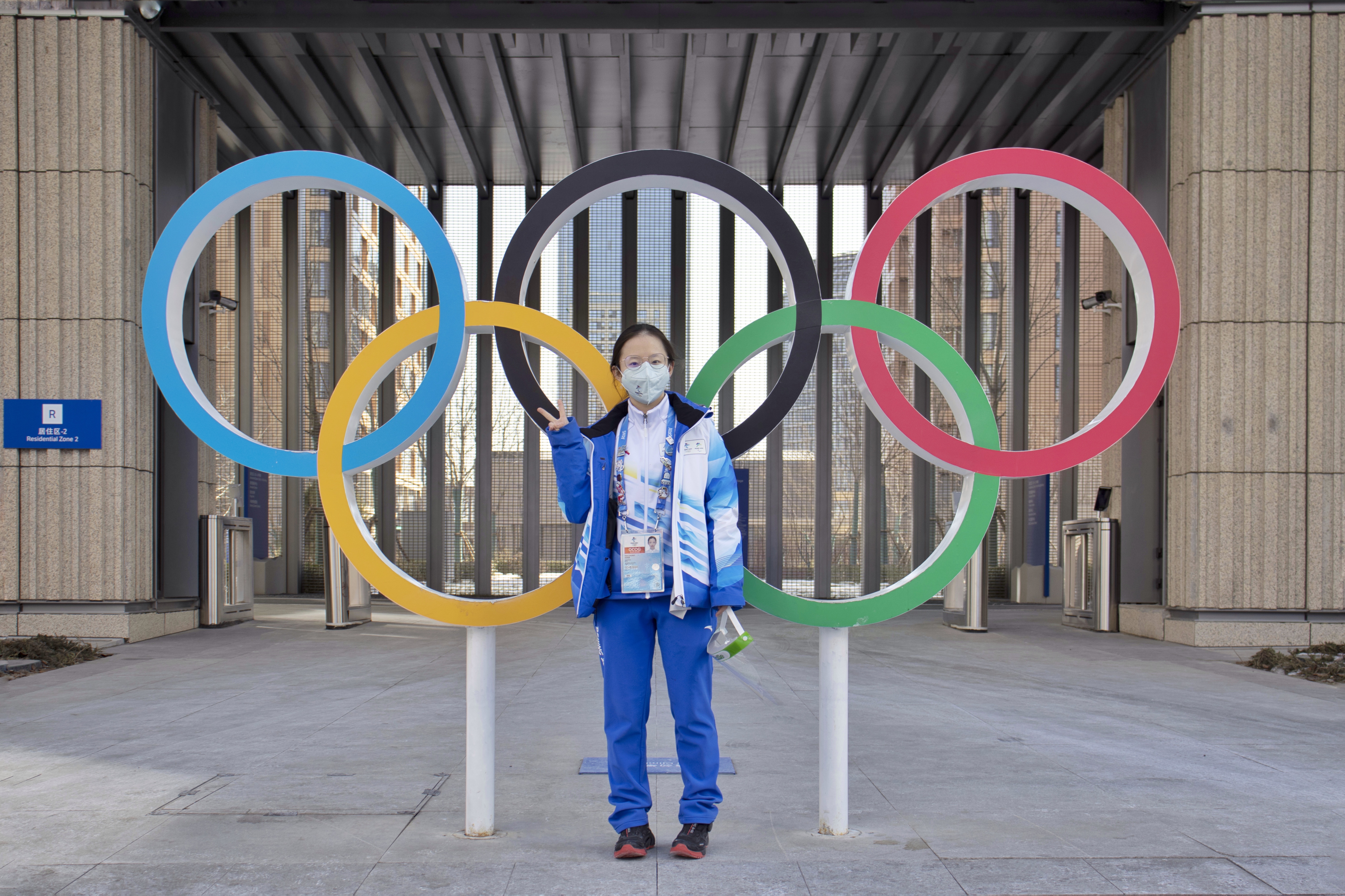 闫淳溪于冬奥村居住区奥运五环前摄影留念