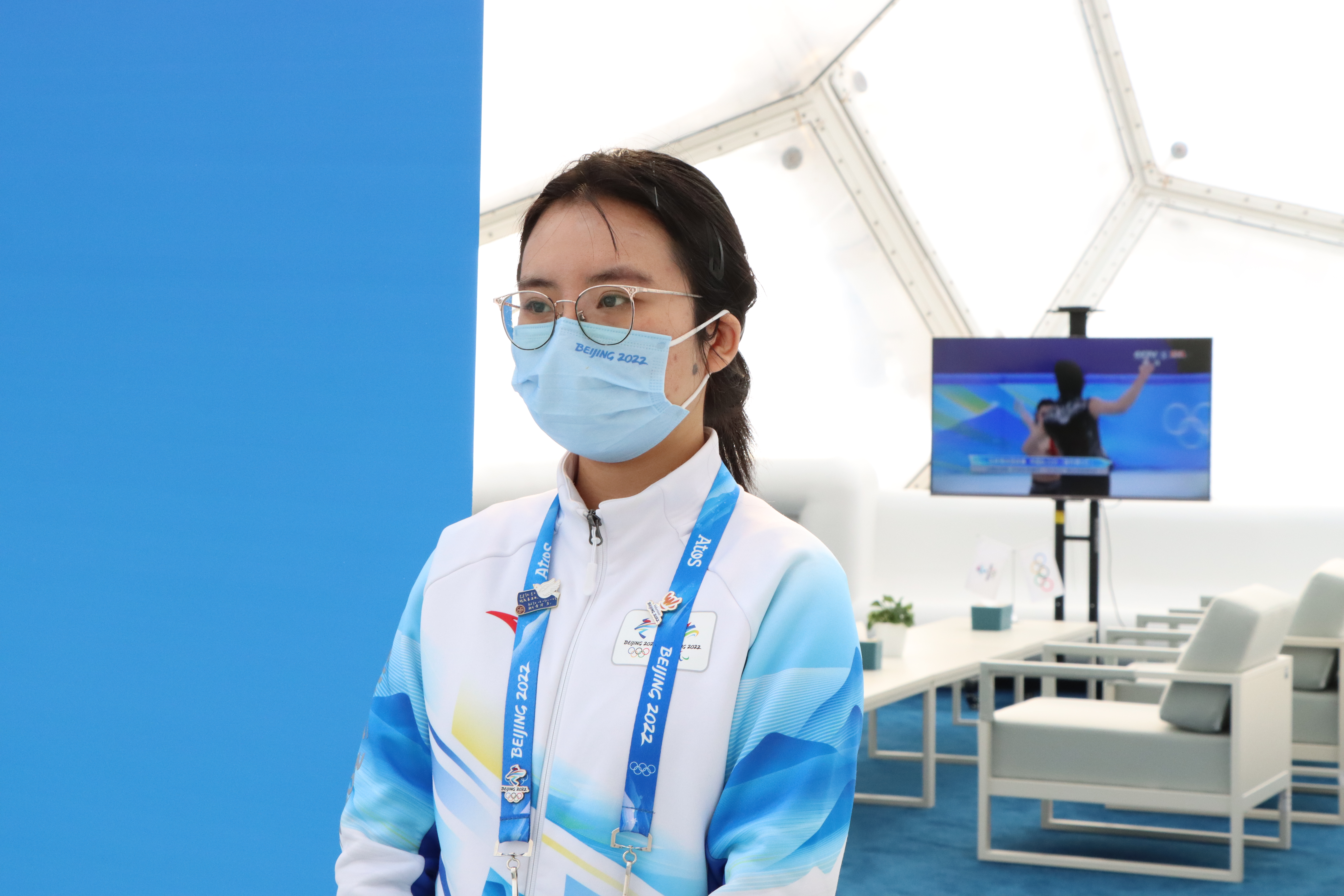 2020级本科生冯鼎的工作地点位于冰立方二层的调度中心,这里既是指挥中枢,也是信息汇聚地。事件跟踪、信息汇总、上传下达、高效服务,“这是一个如心脏般重要的区域”。作为场馆管理领域的志愿者,冯鼎和她和“战友们”每天都在进行着高强度的工作,他们主要负责记录场馆内即时通话的一切消息并整理汇总,以便进行秩序维护和活动调度。“有的领域是三班制,但我们是两班制,这也就意味着一个志愿者每天的工作时长可能会超过十个小时。如果是早班,就要五点半起床,如果是晚班,晚上十一点半才可以回来。”“甚至我们吃饭都要轮流去。”工作虽然辛苦,但“我所在的志愿团队没有一个人因为生病或者其他缘故请过假,所有人全勤到岗”,谈到这句话的时候,冯鼎的眼中闪烁着坚韧与执着。对她而言,披星而去,戴月而归的日常工作就是对志愿精神的最好诠释。