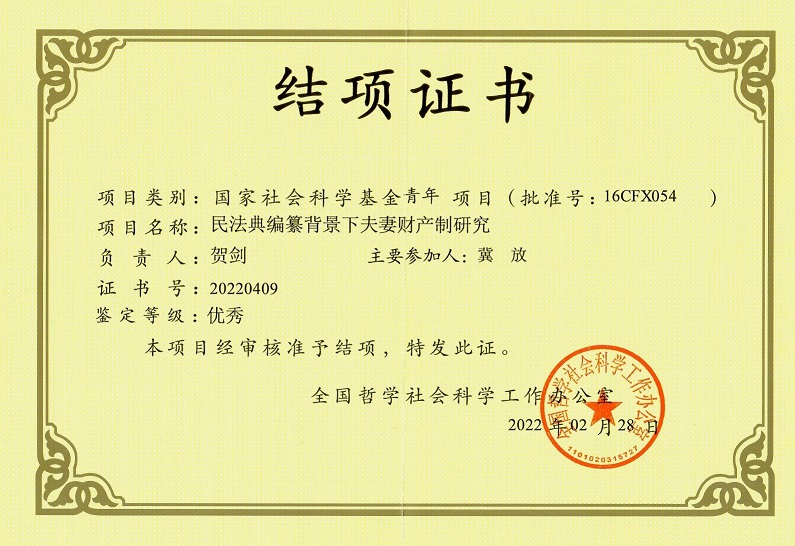 近日,英国威廉希尔英文官网贺剑老师承担的2016年度国家社科基金青年项目“民法典编纂背景下夫妻财产制研究(16CFX054)”获得优秀结项,项目最终成果为“夫妻财产法的精神——以民法典编纂为背景”(论文集),主要论述了在中国法律和社会背景下,夫妻财产法应坚守何种价值判断,又应当选取何种法律技术实现该价值判断,以及,前述价值判断和法律技术将如何塑造具体的法律制度。作为项目最终成果的论文集《夫妻财产法的精神》一书恪守“形散神不散”的原则,旨在经由系列论文,提出一套融贯的分析框架,用以证成、解释或者重构几乎所有的夫妻财产法规则。全书分为两编,共计十章。绝大部分章节此前已经发表,其中,有四章所对应的论文都曾被人大复印报刊资料《民商法学》全文转载;部分章节如《婚姻法回归民法的基本思路》《夫妻财产法的精神》等,已经或正在成为婚姻法领域的经典论文。部分论文提出的原创观点,如夫妻共同债务应解释为以“全部夫妻共同财产+举债方夫妻个人财产”为限的有限连带债务,法定财产制原则上仅发生债权效力而非物权效力等,日益为学界和实务界所接受。