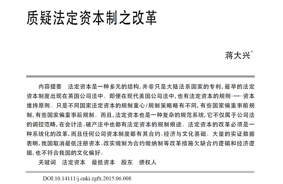 “质疑法定资本制之改革”,蒋大兴,《中国法学》2015年第6期。