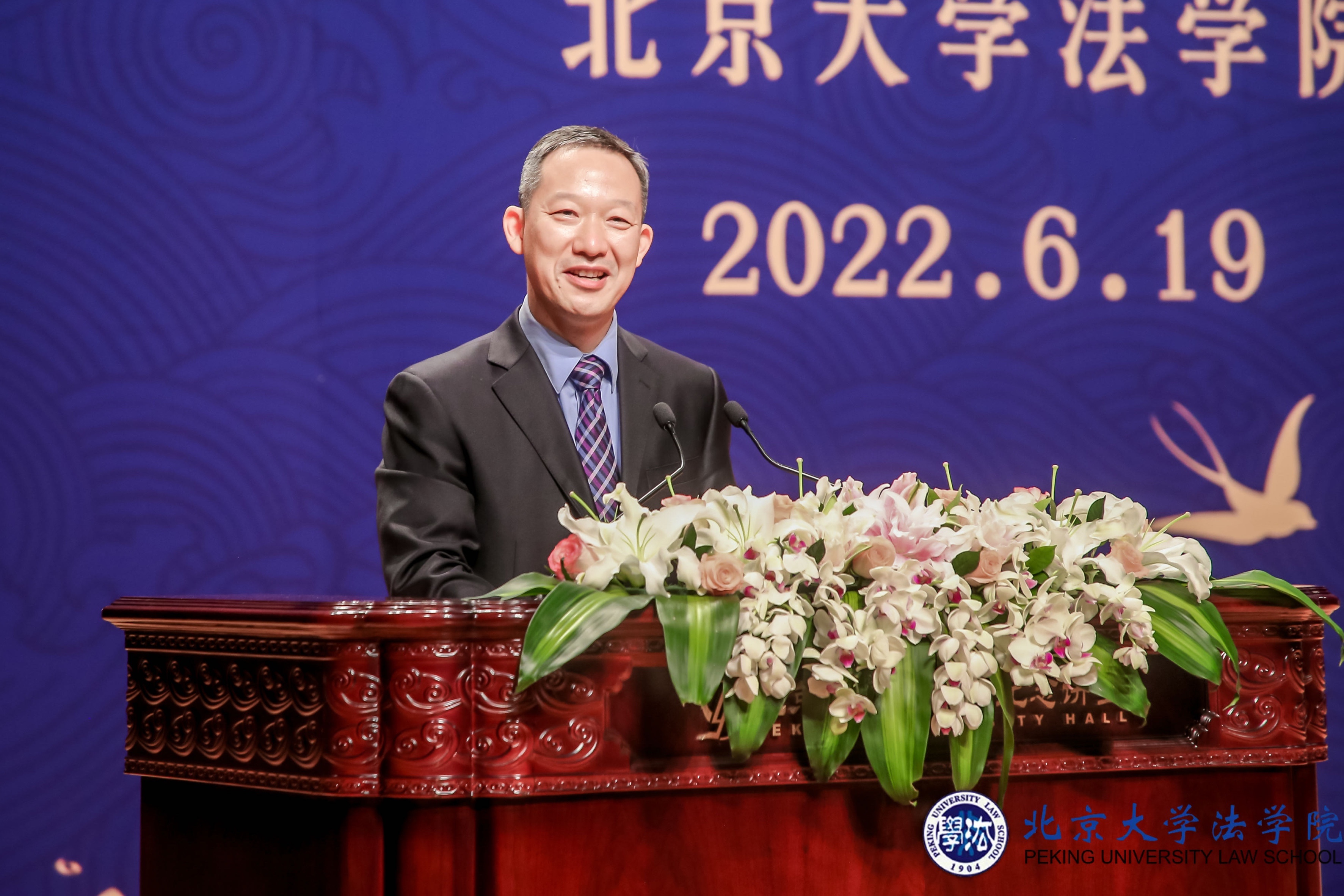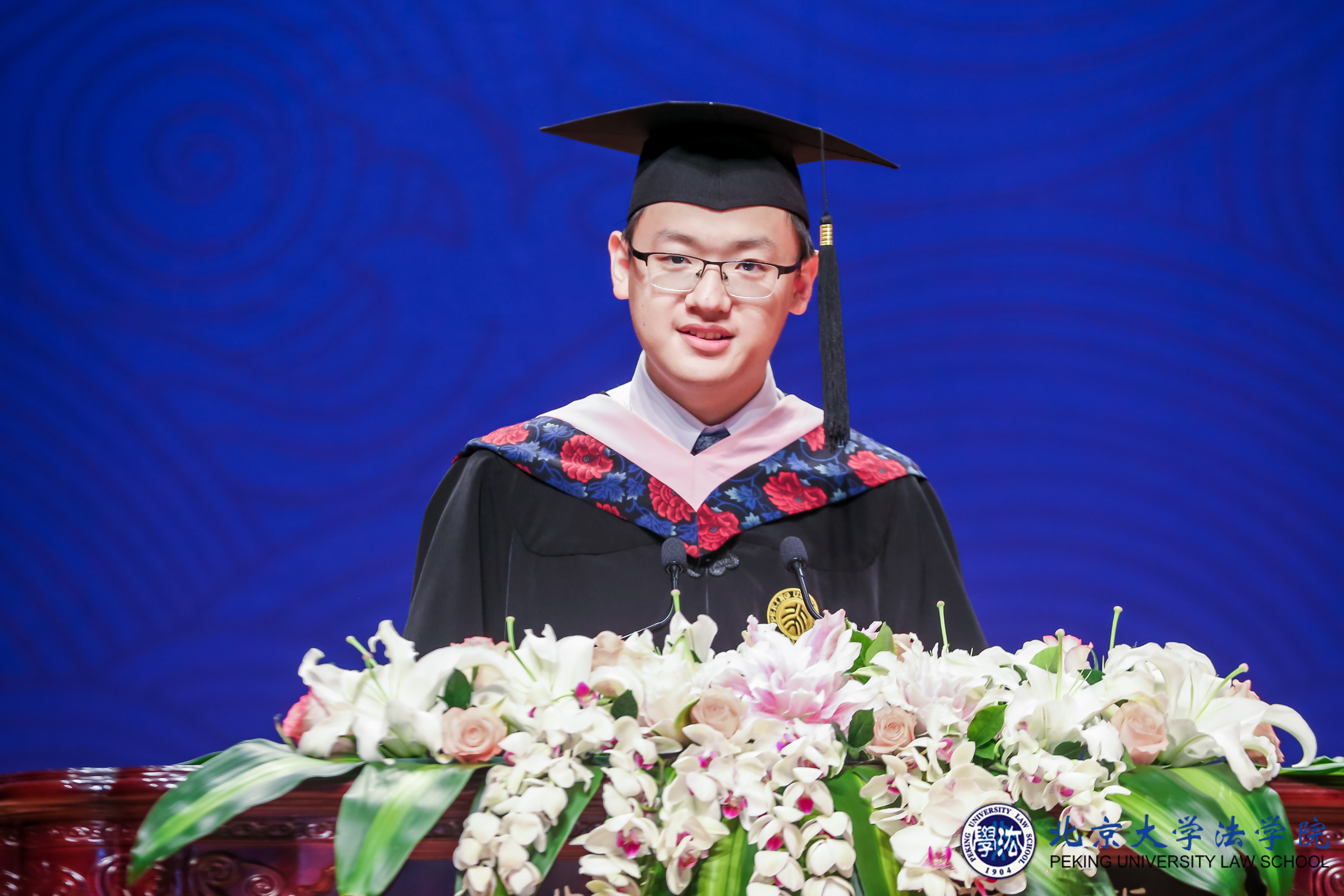 2018级贾平煊同学代表本科毕业生发言。他回顾了四年间与同学们一起经历的美好瞬间,并勉励大家永葆北大法律人的精神底色,把在北大学到的知识内化于心、外化于行,坚持公平正义的信念,追逐学术探索的前沿,恪守职业伦理的底线,将小我融入实现中华民族伟大复兴的历史使命中去,为人民赤诚奉献,为建设法治中国贡献青春力量。