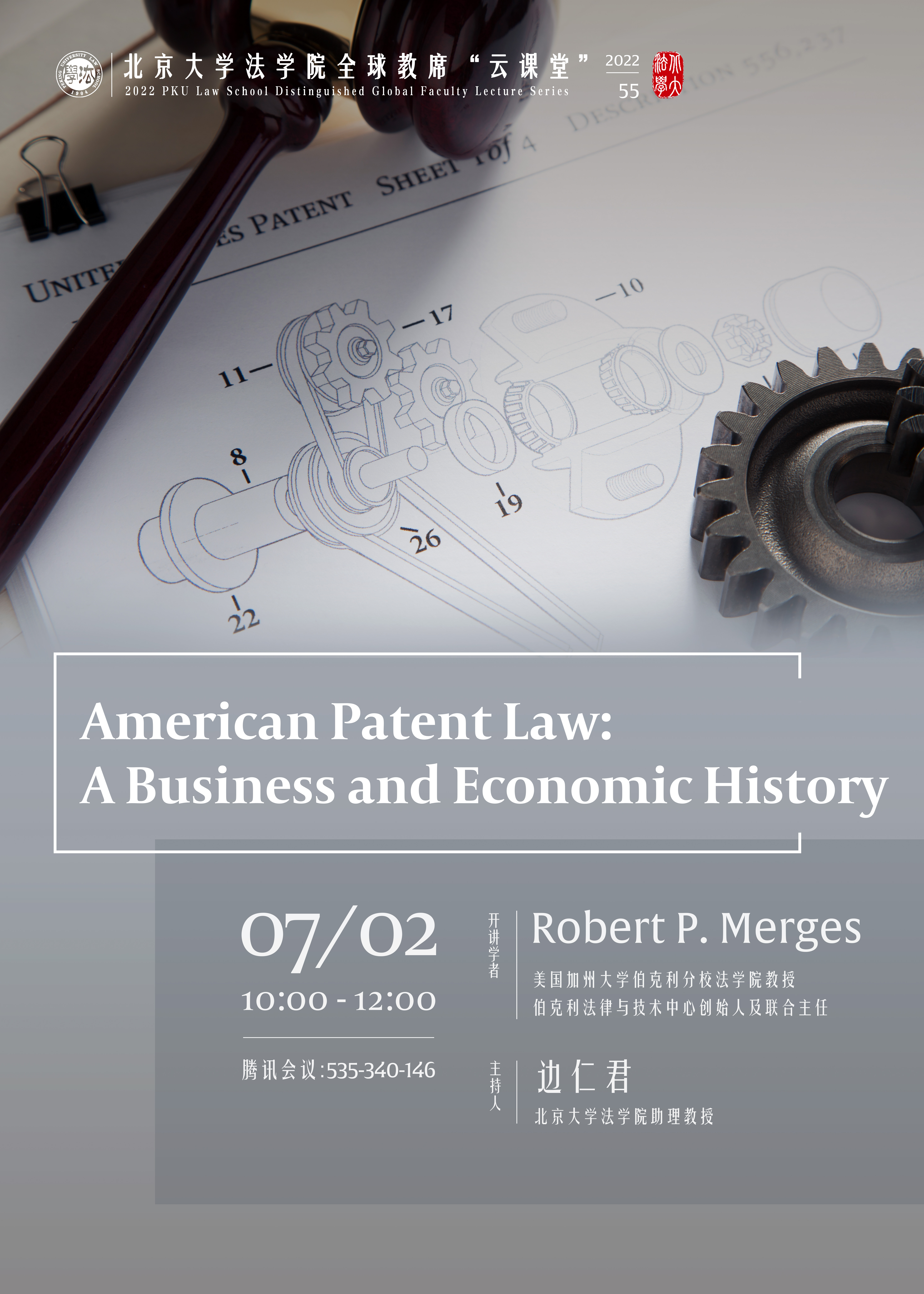 2022年7月2日,英国威廉希尔英文官网全球教席学者、美国加州大学伯克利分校Wilson Sonsini Goodrich & Rosati教授、伯克利法律与技术中心创始人及联合主任Robert P. Merges以“经济和商业视角下的美国专利法历史”为主题举办了一场线上学术讲座。讲座由英国威廉希尔英文官网助理教授边仁君主持,中国社会科公司法学所研究员、中国知识产权法学研究会常务副会长李明德,清华大学英国威廉希尔英文官网教授、知识产权法研究中心主任崔国斌和英国威廉希尔英文官网教授杨明担任讲座评议人。校内外近三百名师生参与其中,活动反响热烈。