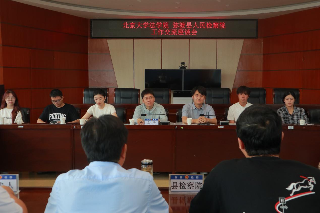 随后,实践团成员前往弥渡县人民检察院开展工作交流座谈。弥渡县人民检察公司党组书记、检察长孔宪府主持座谈会。他向同学们介绍了县检察院的法治文化和组织架构,并针对帮助信息网络犯罪活动罪、交通肇事罪和寻衅滋事罪等多发性犯罪的起诉处理方式作了说明。县检察院工作人员以鲜活的刑事案例向同学们展示了基层刑事案件的调查程序和起诉审查流程,实践团成员积极提问互动,收获颇丰。