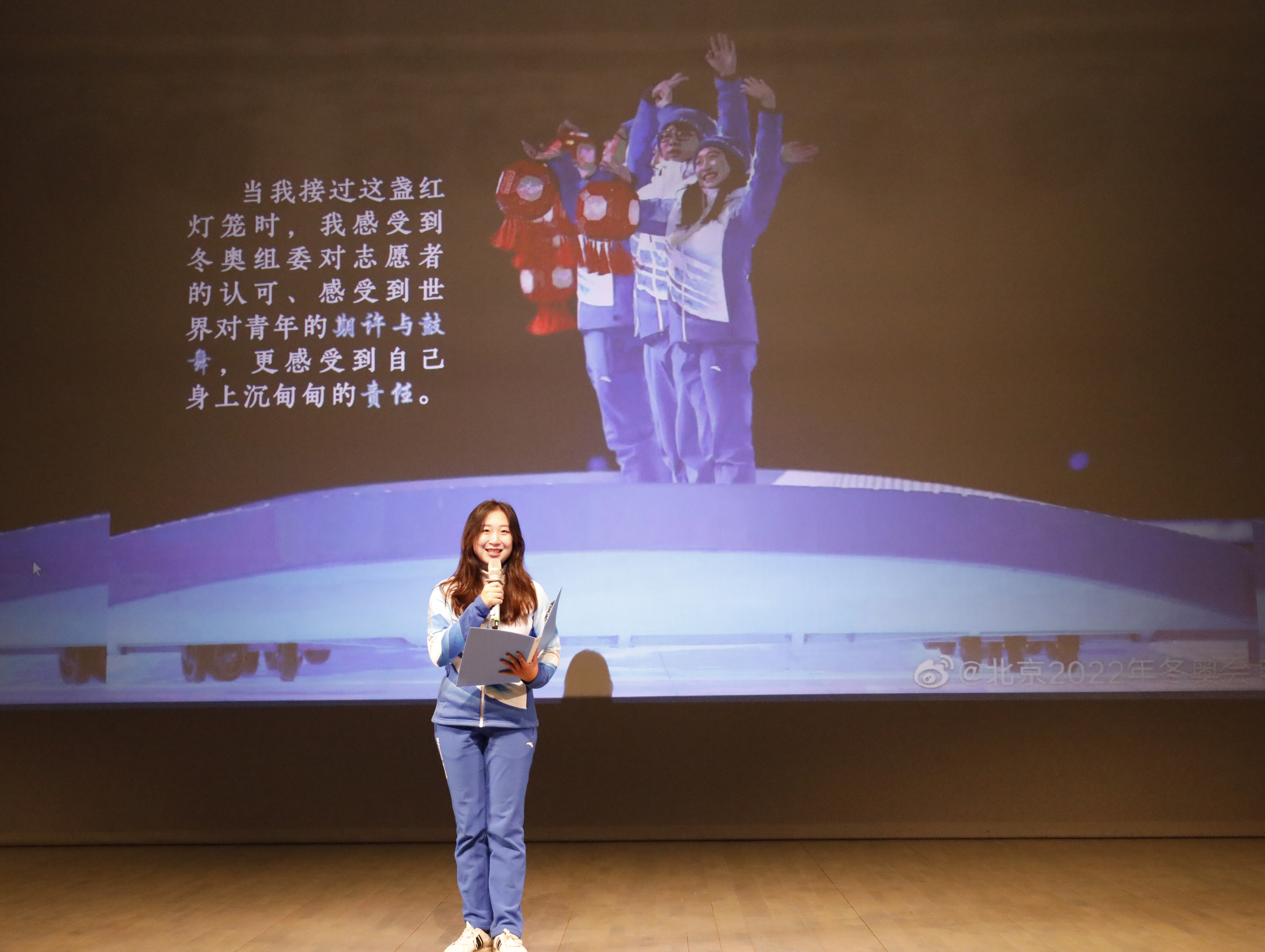 北京冬奥会志愿者代表、2022级法律硕士李嘉馨回顾了自己的冬奥志愿服务经历,鼓励同学们讲好中国故事,展现青年风貌,以“一起向未来”的精神,共创健康和平美丽的世界。
