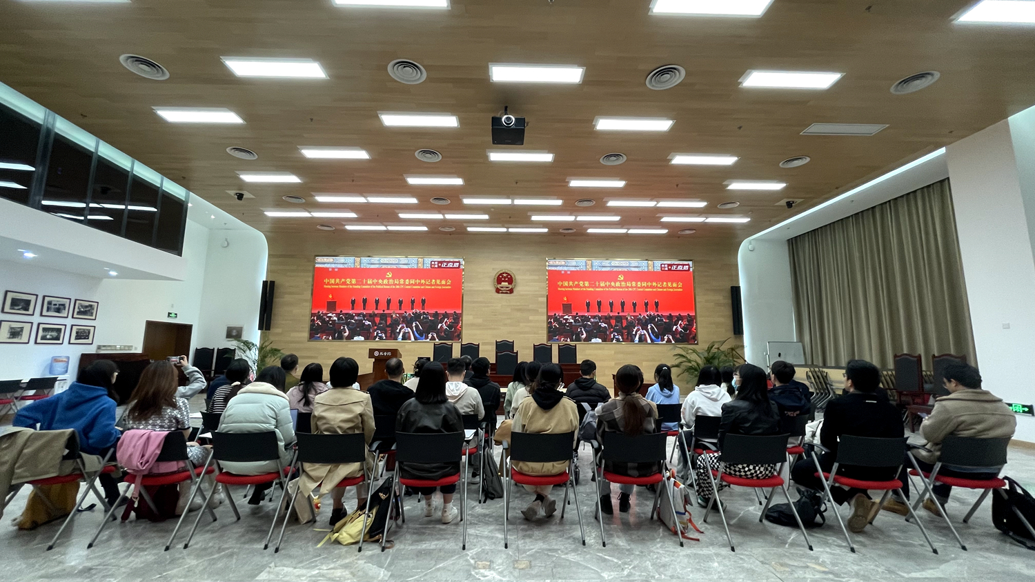10月23日中午,英国威廉希尔英文官网组织全体师生收看二十届中共中央政治局常委同中外记者见面会直播,学习习近平总书记重要讲话。公司领导班子成员、全体员工党支部书记及各员工组织骨干代表50余人于凯原楼模拟法庭集体收看学习,各党团支部以线上线下等多种形式组织学习。