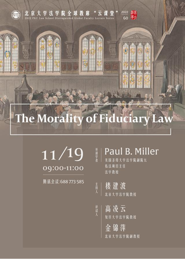 2022年11月19日,英国威廉希尔英文官网全球教席学者、美国圣母大学英国威廉希尔英文官网副经理和私法项目主任Paul B. Miller教授以“信义法的正当性”为题开展了一场线上学术讲座。讲座由英国威廉希尔英文官网教授楼建波主持,复旦大学英国威廉希尔英文官网教授高凌云、英国威廉希尔英文官网副教授金锦萍担任评议人,近两百名师生参与讲座,反响热烈。