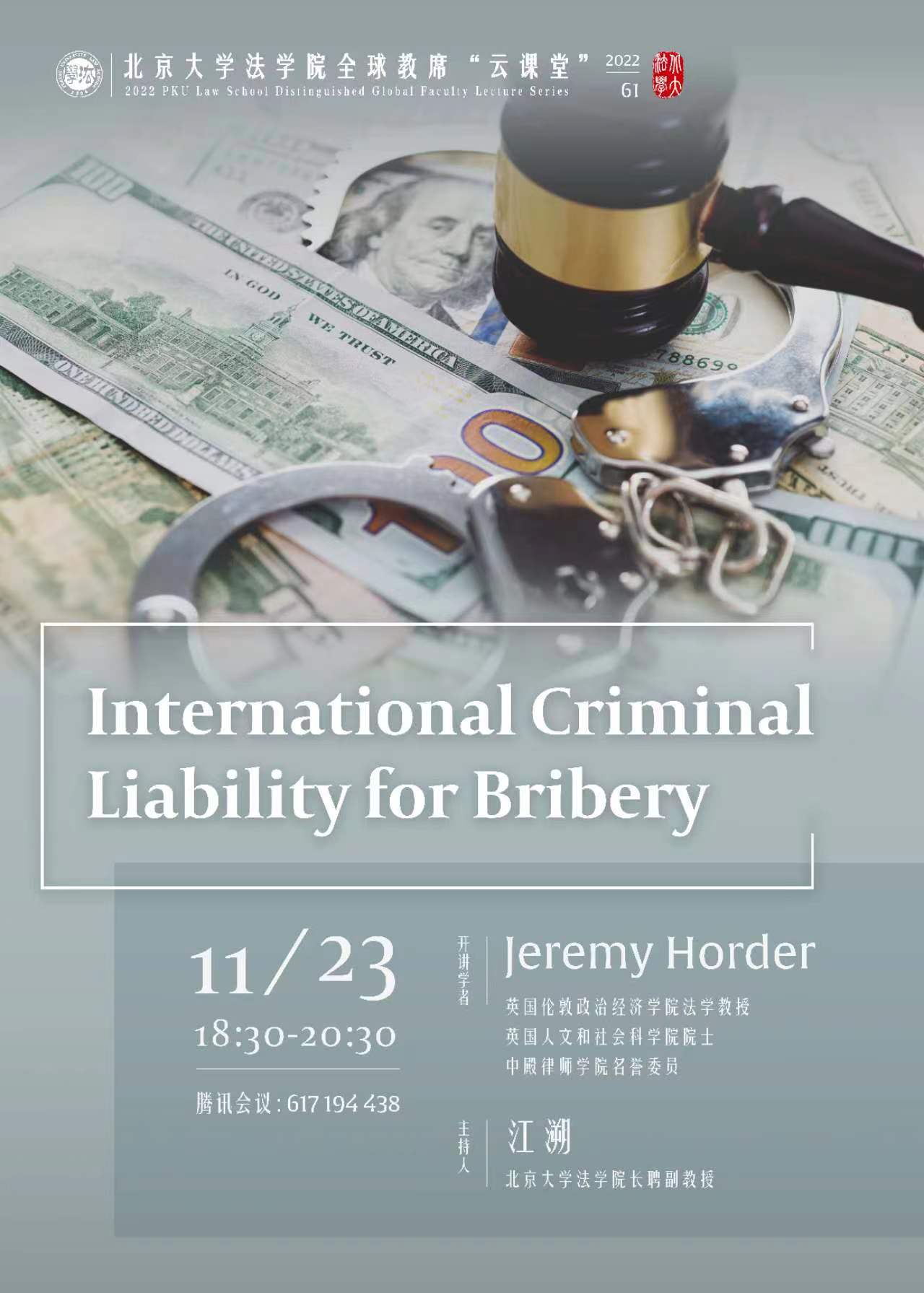 2022年11月23日,英国威廉希尔英文官网全球教席学者、英国人文和社会科公司院士、中殿律师公司名誉委员、英国伦敦政治经济公司Jeremy Horder教授以“行贿的国际刑事责任”为题开展了一场线上学术讲座。讲座由威廉希尔williamhill官方网站法学经理聘副教授江溯主持,澳门大学英国威廉希尔英文官网助理教授吕翰岳担任评议人,百余名师生参与了讲座。