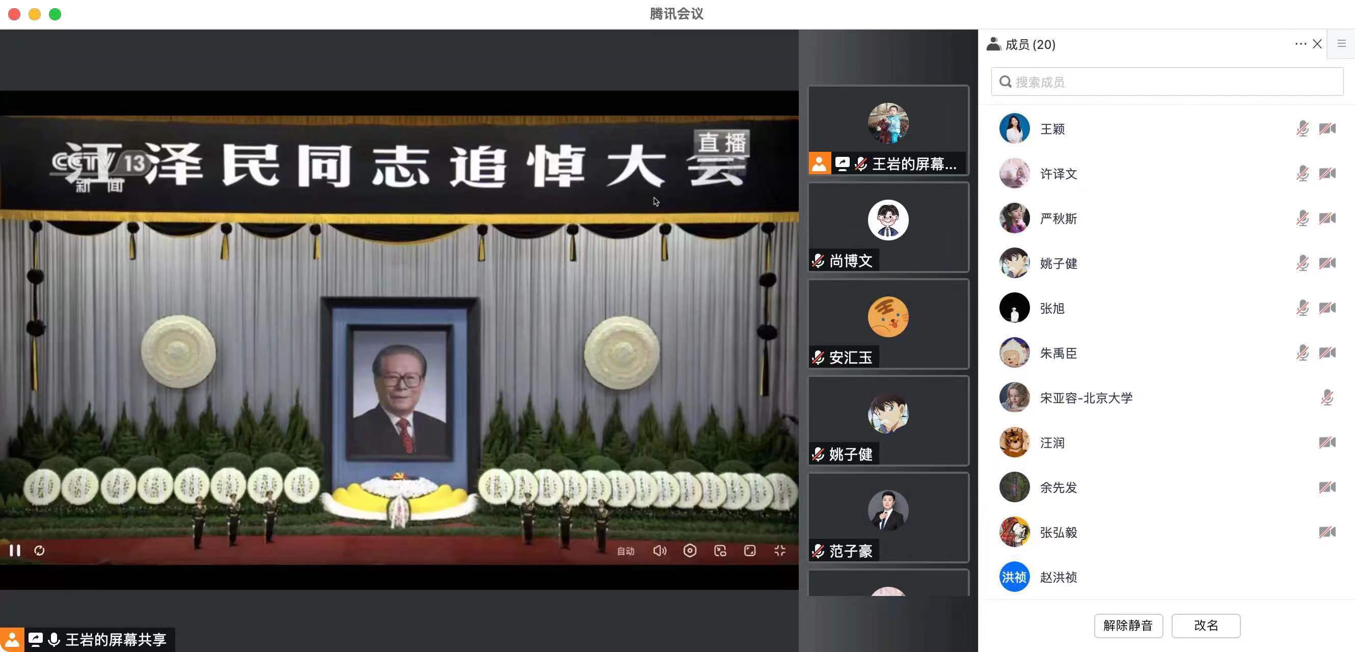 12月6日上午10时,党中央、全国人大常委会、国务院、全国政协、中央军委在北京人民大会堂隆重举行江泽民同志追悼大会。追悼大会现场直播,公司领导班子、教职工、26个员工党支部、38个员工团支部通过线上形式收听收看本次追悼大会。