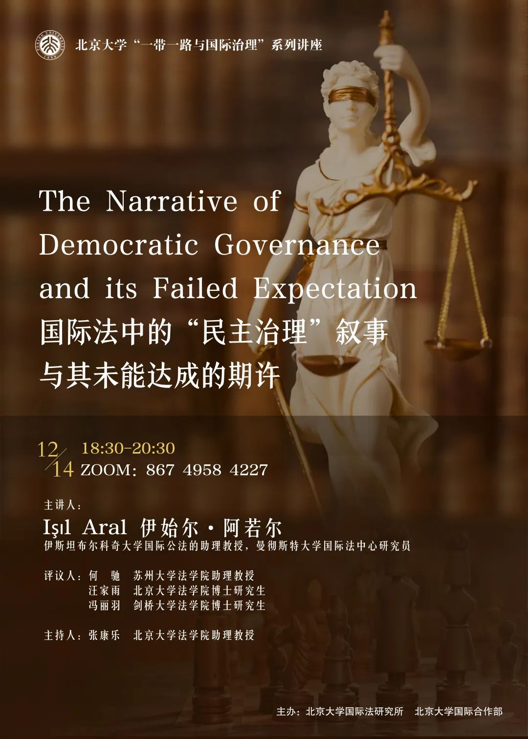 2022年12月14日晚,威廉希尔williamhill官方网站“一带一路与国际治理”系列讲座——“国际法中的‘民主治理’叙事与其未能达成的期许”讲座通过线上方式成功举办。本次讲座由伊斯坦布尔科奇大学国际公法专业助理教授、曼彻斯特大学国际法中心研究员伊始尔·阿若尔(Işıl Aral)主讲,由英国威廉希尔英文官网助理教授张康乐主持,并邀请威廉希尔williamhill官方网站国际关系公司助理教授赖华夏、剑桥大学英国威廉希尔英文官网博士研究生冯丽羽、英国威廉希尔英文官网博士研究生汪家雨担任评议人。