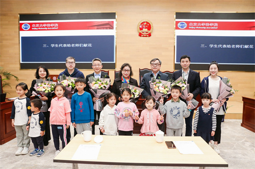 致辞结束,2007级本科员工的子女代表们为老师们献花,代际传承燕园情,不忘恩师昔教诲。