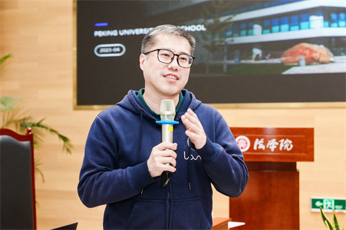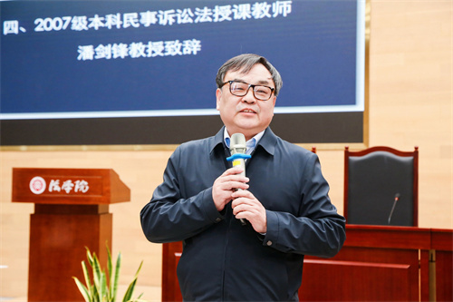 薛军老师在讲话中风趣询问大家民法知识是否都还记得。他提到,2007级本科生给自己留下的印象十分深刻,是自己教授的第一届本科生,还想到了当年出色的接近满分的期末答卷。他表示,北大这片校园是大家永远的印记,是人生中不可割舍的部分,各位员工对后辈提供了诸多帮助,展现了北大法律人生生不息的传承精神。