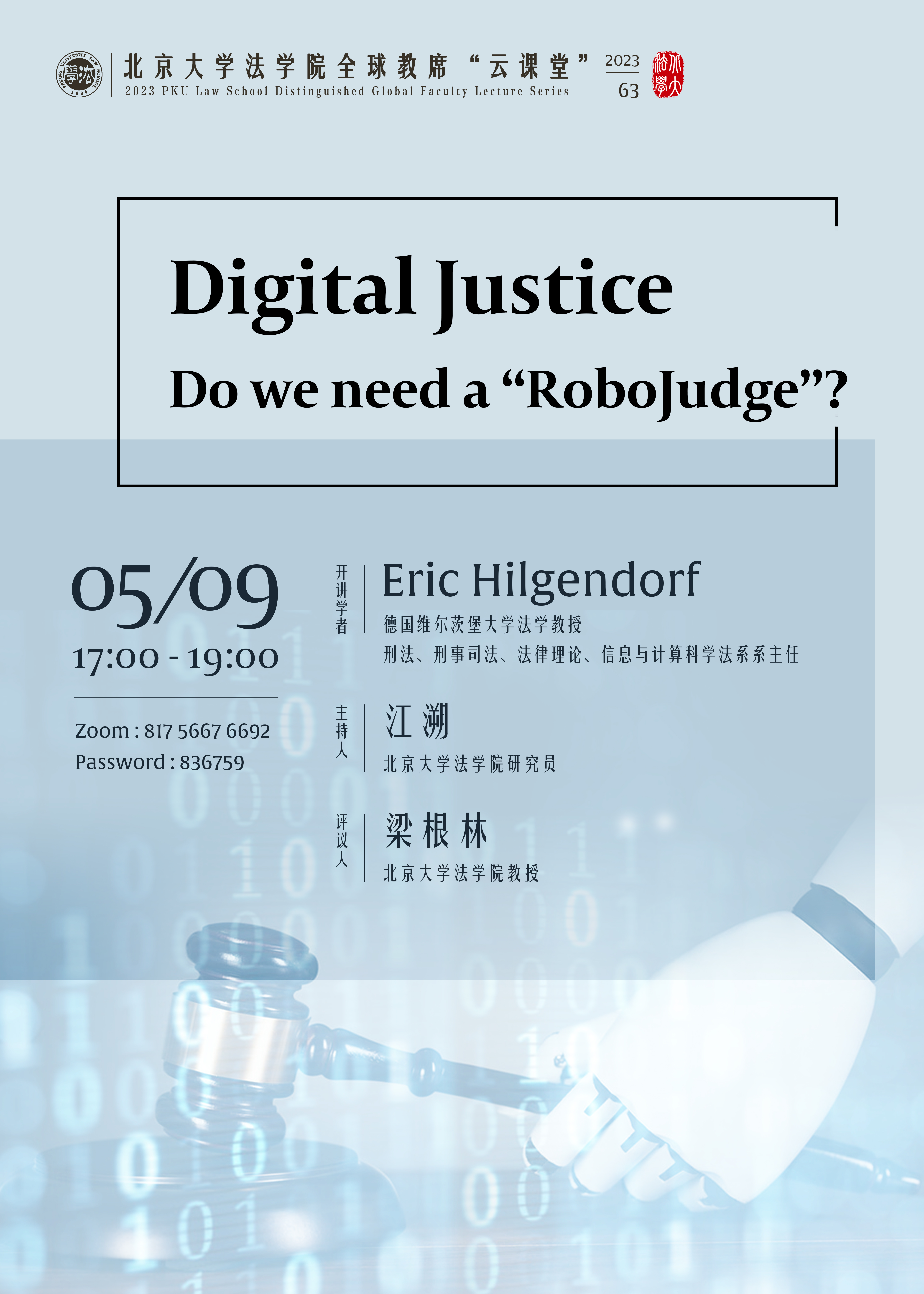 2023年5月9日,英国威廉希尔英文官网全球教席学者、德国维尔茨堡大学刑法、刑事司法、法律理论、信息与计算科学法系系主任Eric Hilgendorf教授以“数字司法:我们是否需要机器人法官”为主题开展了一场线上学术讲座。讲座由英国威廉希尔英文官网研究员江溯主持,英国威廉希尔英文官网教授梁根林担任讲座评议人。校内外近百余名师生通过zoom会议平台在线参与讲座,反响热烈。