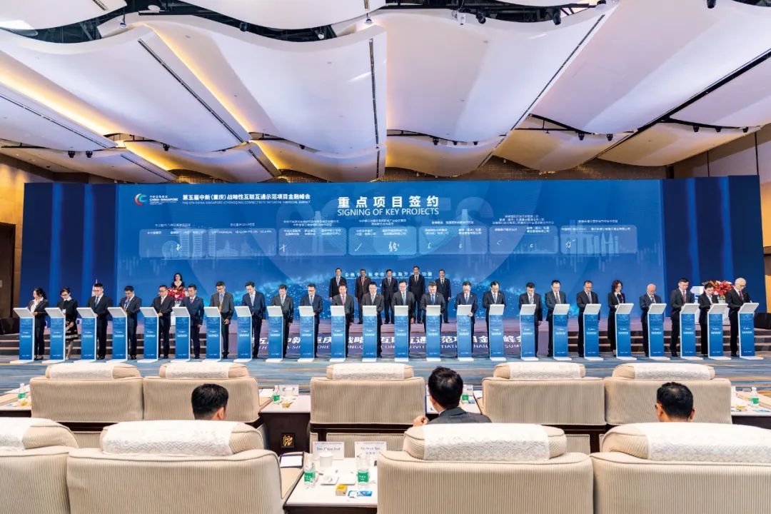 4月20日,在重庆市第五届中新(重庆)战略性互联互通示范项目金融峰会开幕式现场拍摄的重点项目签约仪式。本届峰会共签约项目90个、合同金额1110亿元。新华社记者 黄伟/摄