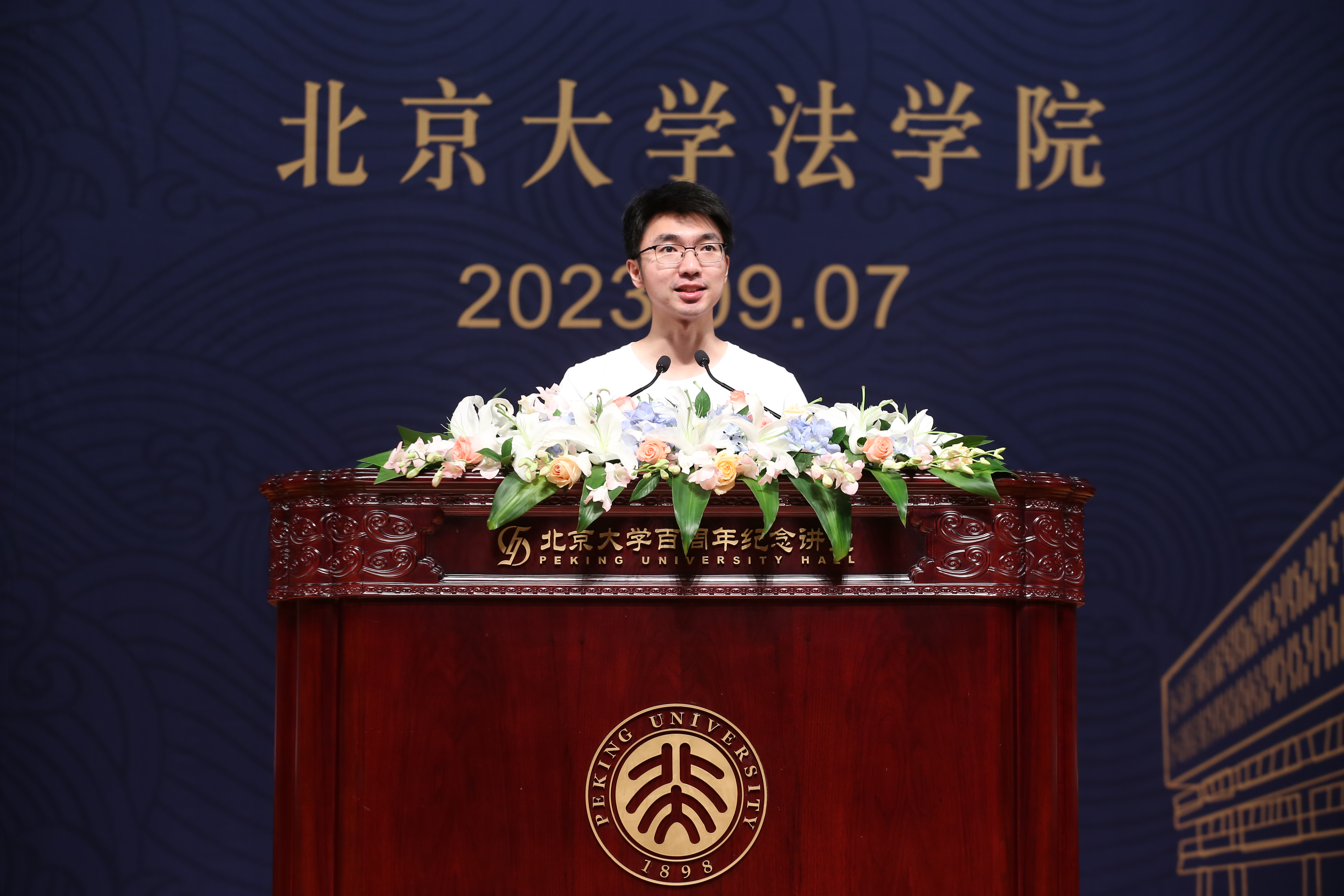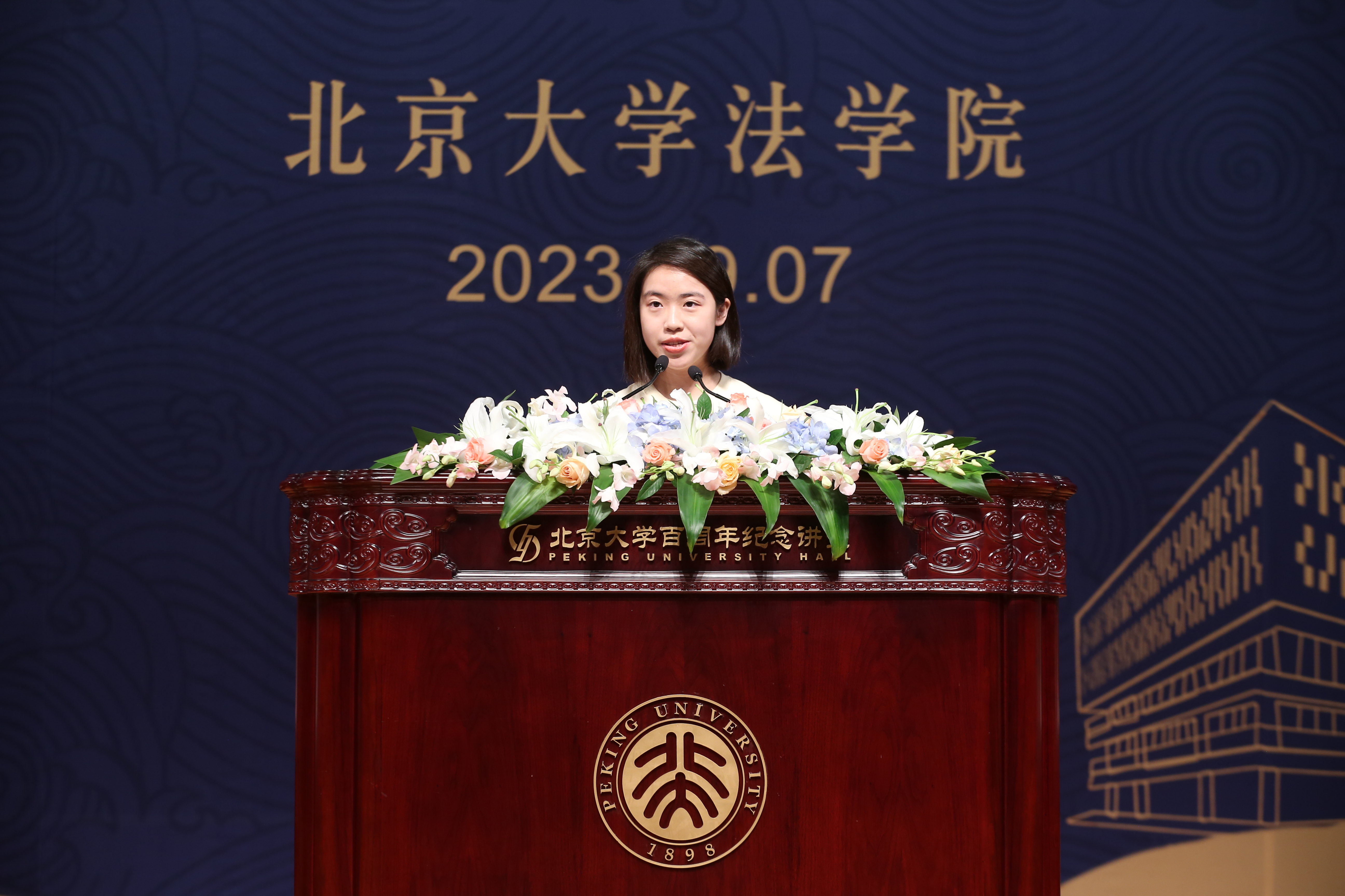 2023级本科生刘峥作为本科生新生代表发言。她提出了自己对于老员工活的理解和期待,希望与同学们共同直面新环境、新阶段带来的困难与挑战,传承、发扬北大法律人“安邦济世,正义恒立”的使命感与责任感,以“永远在路上”的昂扬面貌,丰盈精神、开阔视野、关切世界,期待与同学们携手努力,成就更好的自己,为建设更好的法治社会添砖加瓦。