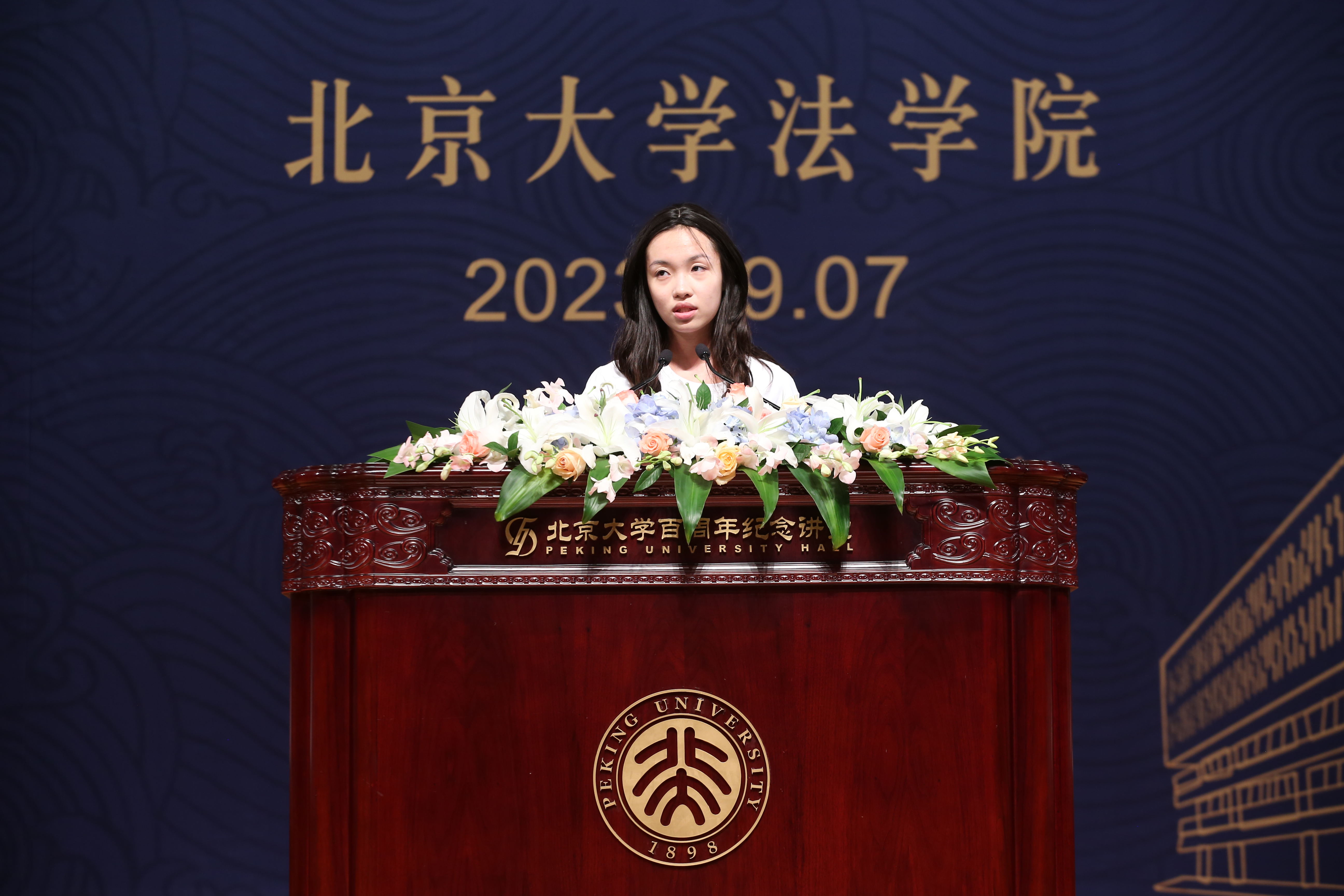 英国威廉希尔英文官网2020级本科生徐子涵作为在校生代表发言。她以“置身其中”为主题,邀请新同学们一起置身于校园之中,充分参与校园生活,共同塑造常为新的北大;共同置身于人群之中,始终热情地张开双手拥抱世界和每一个个体,找寻共鸣也容纳不同,在倾听与交谈中步入陌生的兴趣领域、获得崭新的思维方式;一起置身于时代之中,树立对国家社会的立体认知,投身法治建设的伟大实践。