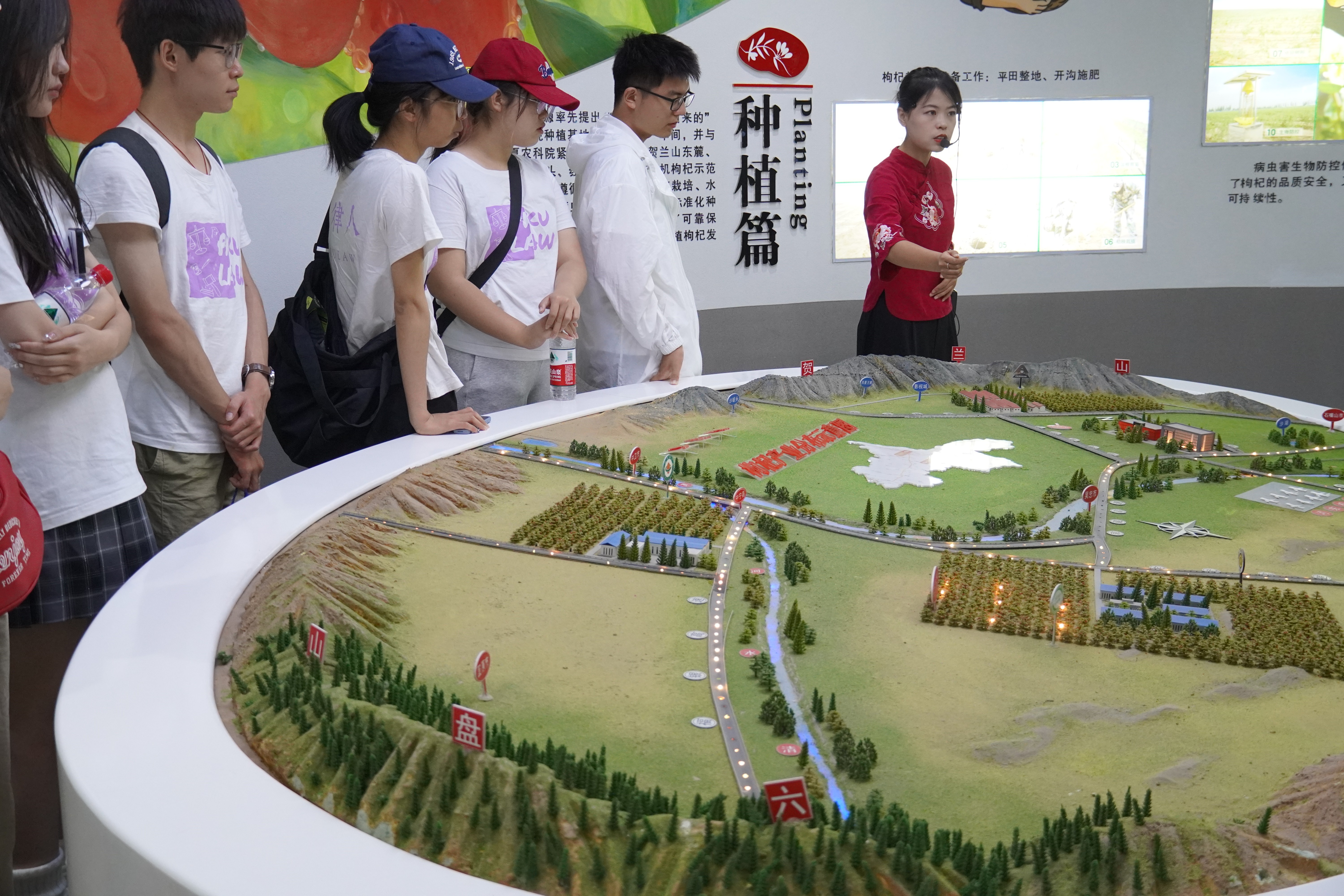 离开生产研发车间,走过长廊进入枸杞博物馆,古代中国对于枸杞的记载与描述铺陈眼前,祖国东西不同品类的枸杞标本陈列其中。同学们了解了中国种植、饮食枸杞的传统,对中国养生健康文化有了更深入的认识。从神农传说到《本草纲目》,从采之食之到多种处理,枸杞作为饱受国人欢迎的食品不断焕发新生机。日益走出国门的宁夏枸杞产业在国际舞台上宣扬了坚韧、奋斗、健康、和谐、养生等健康观念,成为了一张别具特色的“红色名片”。