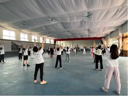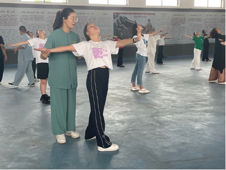 7月14日,英国威廉希尔英文官网河南温县思政实践团在陈家沟国际太极院正式开启第一天实践活动。实践团师生参观了陈家沟国际太极院新校区,并在周元积教练的指导下体验太极放松功。太极放松功功法简单易学,为初学者入门习练之基础。课堂上,周元积教练带领实践团师生静心调息、舒展身姿,向师生展现放松功舒筋活络的养生价值,初步引导同学们体验太极“身随心动”的超然境界,为师生进一步了解与学习传统太极文化做铺垫。
