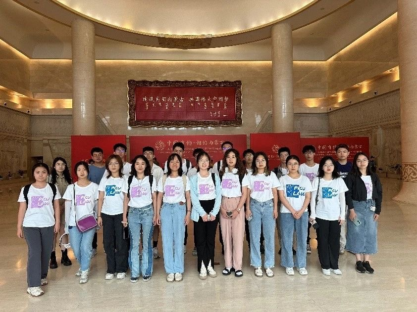7月12日下午,实践团师生到达内蒙古博物院参观学习。走进博物院,映入眼帘的是大厅中央习近平总书记的题词——“建设亮丽内蒙古,共圆伟大中国梦”,点明了这座博物院的主基调。“亮丽内蒙古”“飞天神舟”“解放之路”“交融汇聚”四个专题展厅融合现代元素、民族特色和地域表征,带领同学们沉浸式感受内蒙古这篇土地的盎然生机与无限活力。中华文化多元一体,中华民族亲如一家。内蒙古自治区广袤辽阔的土地上,孕育着绚丽多彩的民族文化,凝聚着民族团结的强大力量,身临其境,铸牢中华民族共同体意识更牢固地扎根师生们心底。