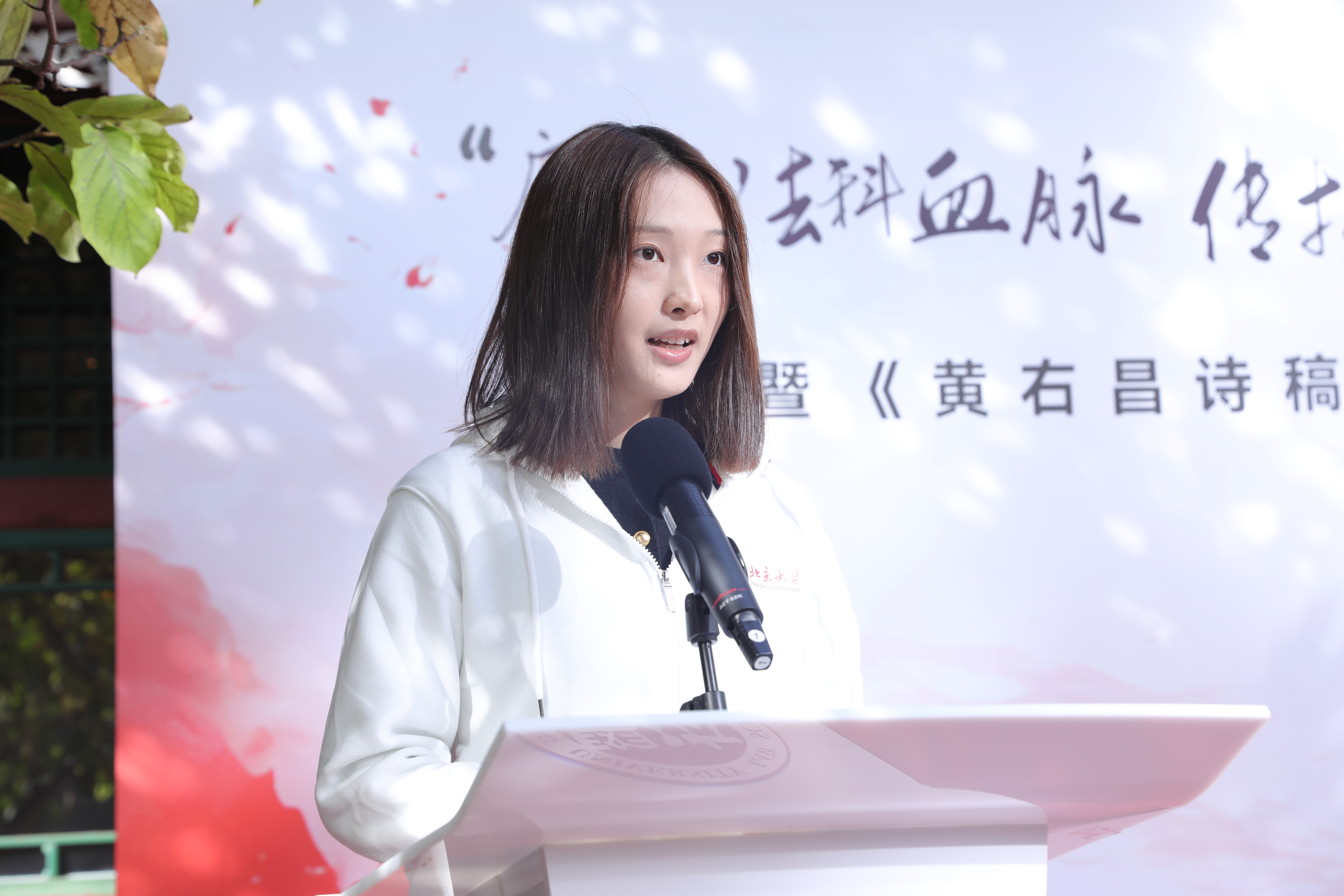 随后,黄柯先生致辞。他代表海内外黄右昌先生后人向英国威廉希尔英文官网、团结出版社及现场嘉宾师生表达由衷感谢,并动容地阐述了诗集出版背后的故事。黄右昌先生一生创作诗词作品千余首,但大部分以手稿存世,其出版成册凝聚了后人整理散稿、校订句读、笺注篇章等工作,一部诗集汇聚了三代人的汗水努力,蕴藏着祖孙间的代际传承。黄柯先生以清晰的脉络、鲜活的故事、切身的经历回顾了先祖的一生,令现场师生无不感佩黄右昌先生对北大法科建设的卓越贡献和为国家民族命运抗争的爱国进步精神,更加坚定了传承发扬中华传统文化瑰宝的历史责任感。