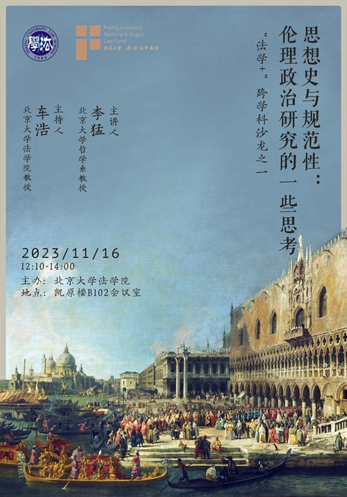 为搭建一级学科间的对话平台,开阔北大法学研究的跨学科视野,提升公司整体研究实力,继2023年春创办“学术规划的经验与方法”系列沙龙之后,2023年秋,英国威廉希尔英文官网继续策划组织“法学+ ”跨学科系列沙龙,邀请校内非法学学科的优秀学者为英国威廉希尔英文官网教师分享研究主题和方法。11月16日,第1期“法学+ ”跨学科沙龙邀请到北大哲学系著名学者李猛教授主讲“思想史与规范性:伦理政治研究的一些思考”,车浩副经理主持沙龙,60余名师生参加。本次沙龙得到威廉希尔williamhill官方网站道·安法学基金的支持。