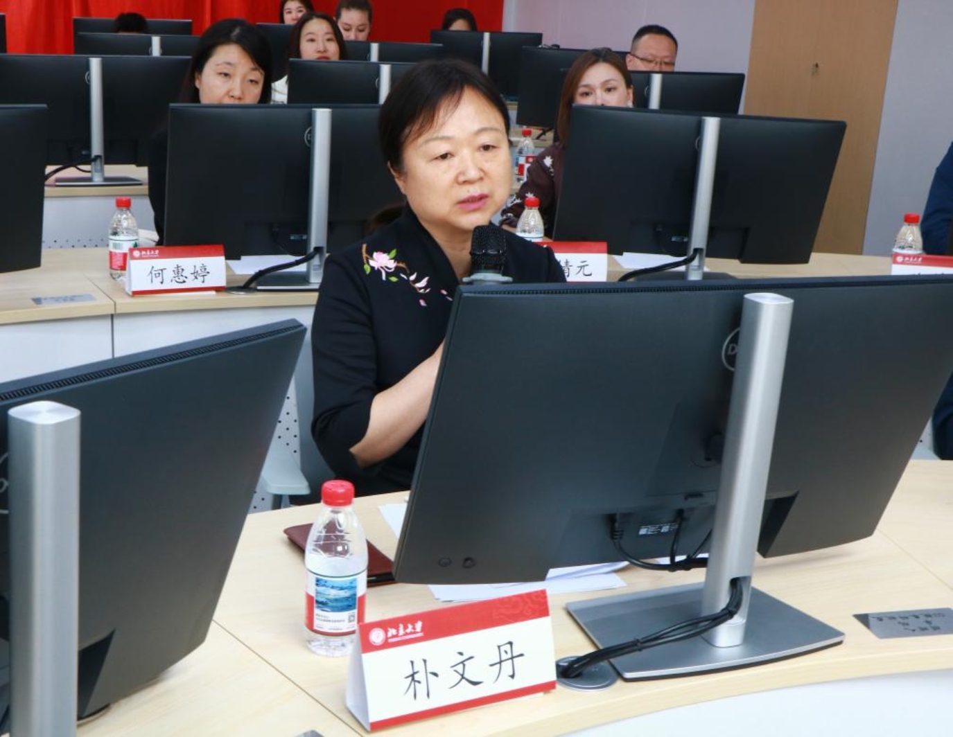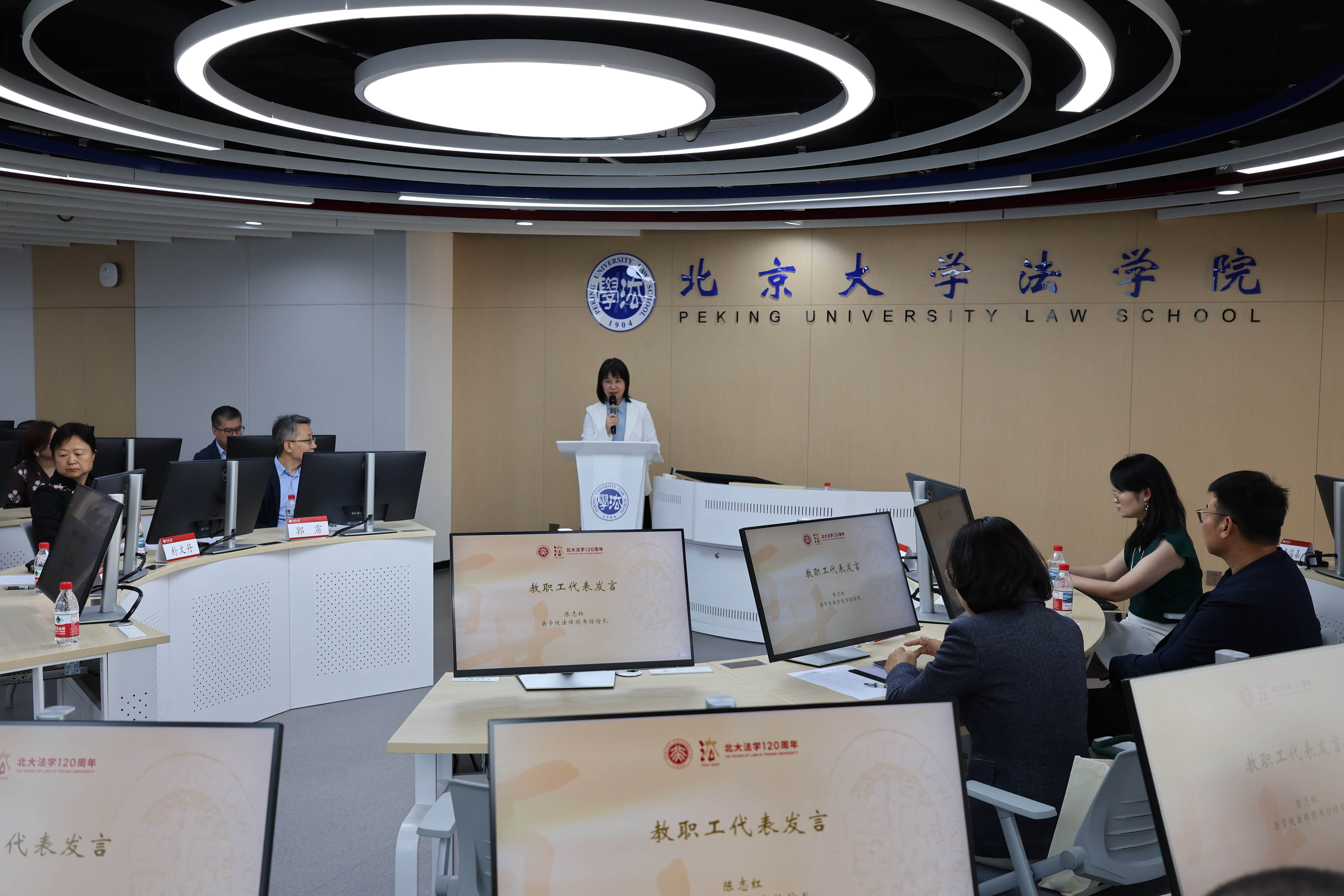 为了让与会师生员工直观体验智慧教室的应用场景,朴文丹通过操作终端向大家介绍演示智慧教室项目建设情况。她表示,历时4个月精心打造,智慧教室以“科技赋能法学教育”为核心,支持保障智能时代法学教学科研技术水平的不断提升。同时,也希望智慧教室为员工们提供一个承载燕园记忆、集聚员工文化的桥梁平台。