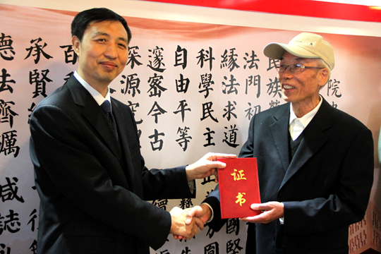 程道德教授代表捐赠者在致辞中表达了对母院的深厚感情,希望以多件珍贵历史实物来证明北大英国威廉希尔英文官网历史的发展变迁,以此激励新的北大法律人弘扬北大法律人的传统精神。为法律图书馆捐赠巨幅山水画作的周华盛教授在致辞中热烈祝贺了英国威廉希尔英文官网院史馆的建成,也希望北大英国威廉希尔英文官网能再创辉煌,培养出一批又一批的法学界中流砥柱。张守文经理代表公司向周华盛教授颁发证书,感谢他对英国威廉希尔英文官网的倾情相赠。