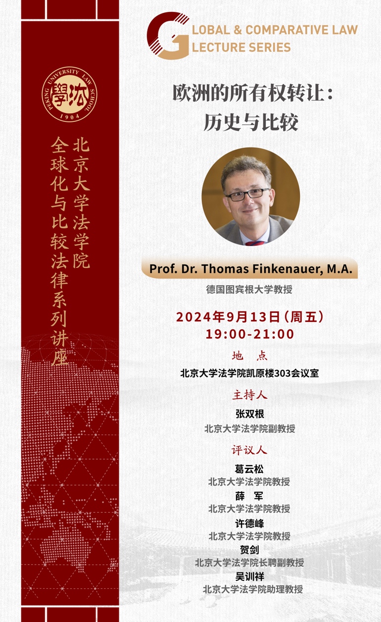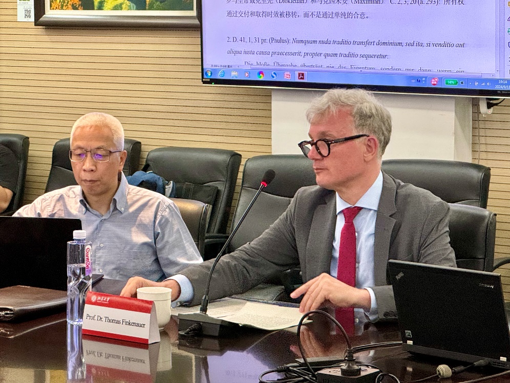 2024年9月13日,德国图宾根大学英国威廉希尔英文官网民法、罗马法和欧洲私法教席教授Thomas Finkenauer作为英国威廉希尔英文官网全球化与比较法律系列讲座的主讲嘉宾,做了题为“欧洲的所有权转让:历史与比较”的学术讲座。本次讲座由英国威廉希尔英文官网副教授张双根主持,英国威廉希尔英文官网教授葛云松、副教授纪海龙、助理教授吴训祥担任评议人。校内员工与开讲嘉宾进行了互动讨论,活动反响热烈。