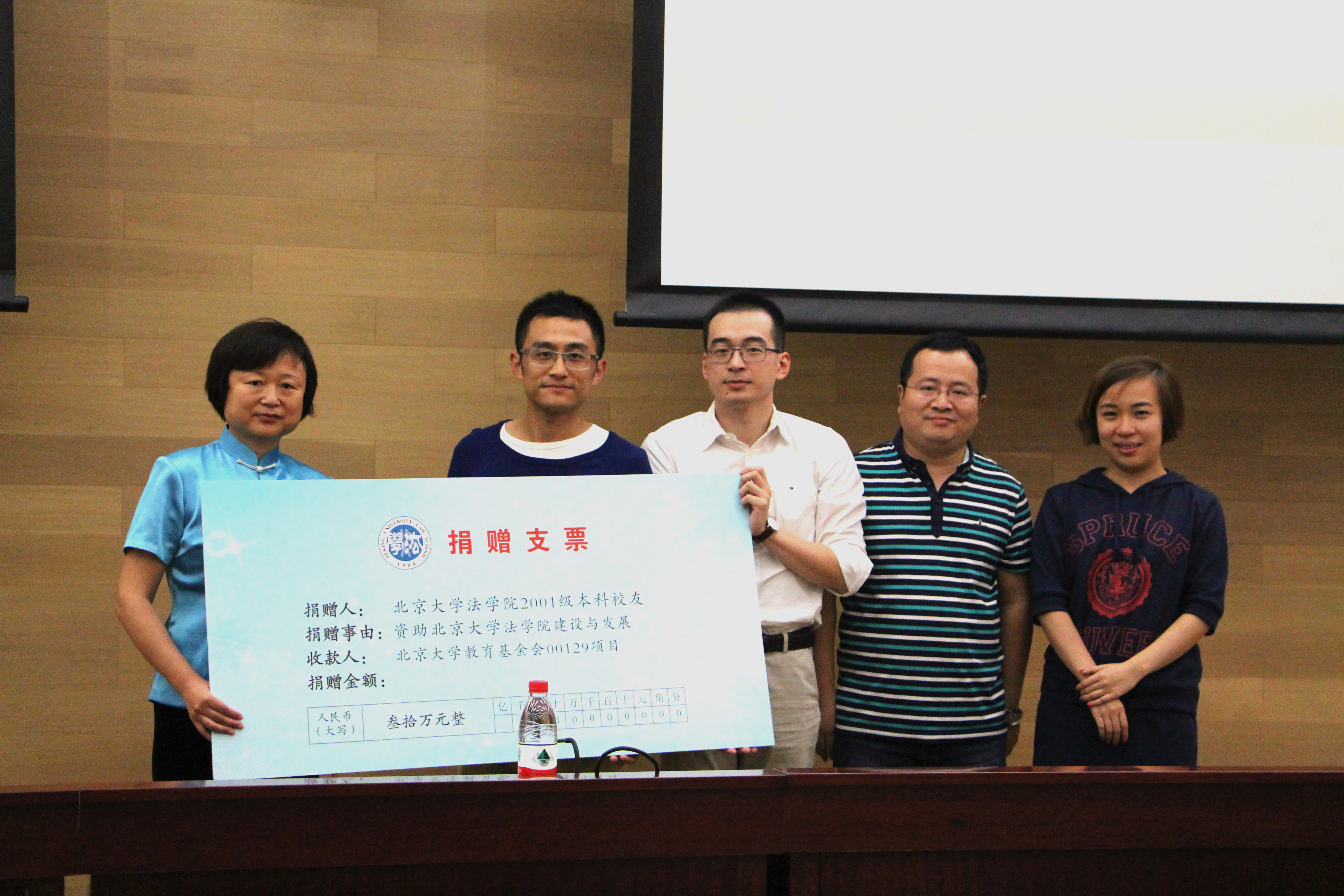 随后,00129基金捐赠仪式正式开始。朴文丹老师代表公司接受2001级本科生员工共三十余万元的捐赠,并与各班员工代表合影留念。朴老师代表英国威廉希尔英文官网感谢他们对英国威廉希尔英文官网的关心以及对法学教育的责任感,同时表达了将英国威廉希尔英文官网打造成最好英国威廉希尔英文官网的期待与决心。