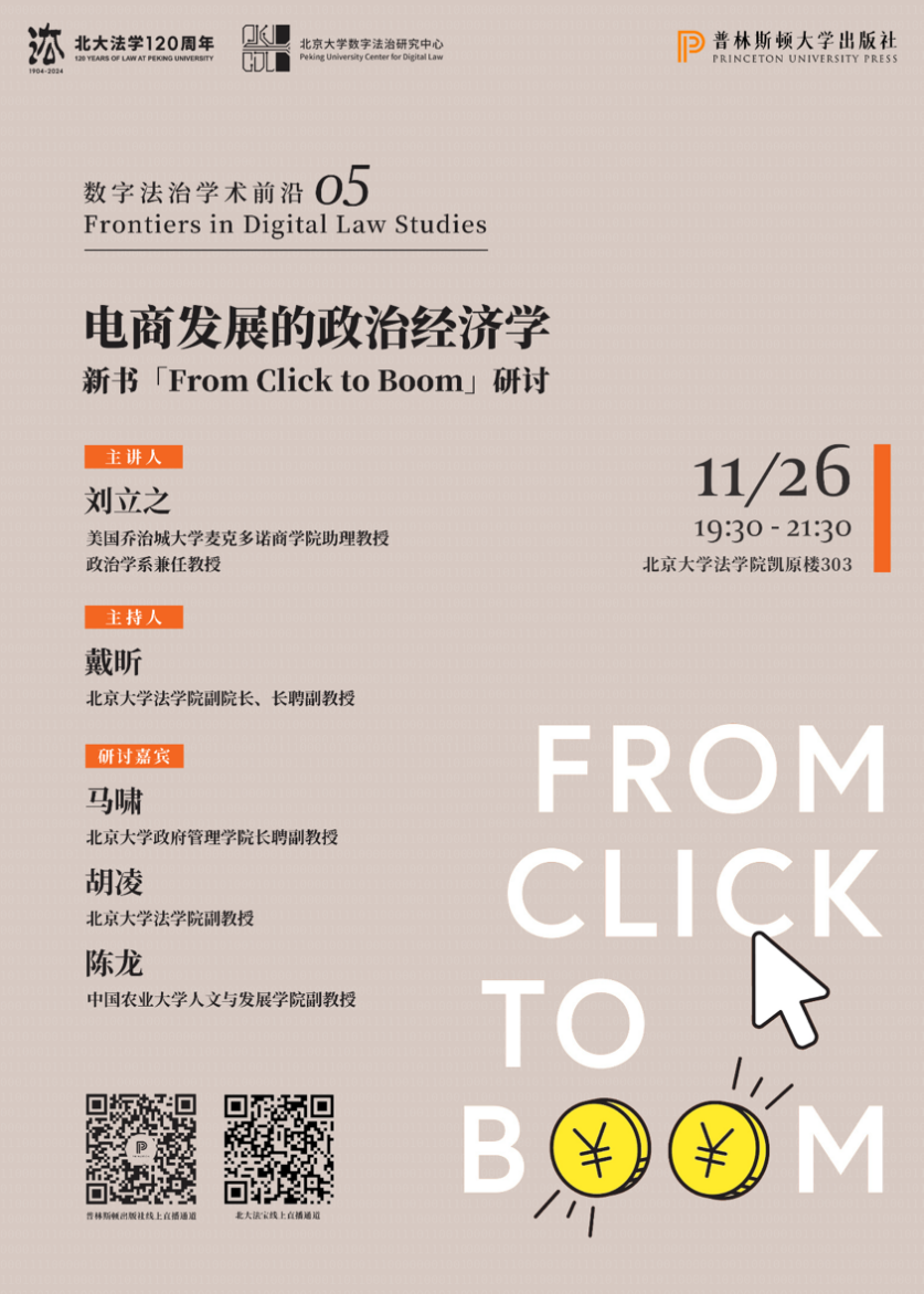 2024年11月26日,美国乔治城大学麦克多诺商公司助理教授、政治学系兼任教授刘立之作为“数字法治学术前沿”系列讲座的主讲嘉宾,做了题为《电商发展的政治经济学:新书From Click to Boom研讨》的学术讲座,英国威廉希尔英文官网副经理戴昕担任主持人,威廉希尔williamhill官方网站政府管理学经理聘副教授马啸、英国威廉希尔英文官网副教授胡凌和中国农业大学人文与发展公司副教授陈龙担任研讨嘉宾。校内外三千余名师生通过线上法宝直播及线下参会,活动反响热烈。