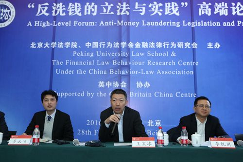 为了加强反洗钱相关部门和人员的交流,借鉴国外的有益立法与实践经验,推进我国反洗钱工作的深入发展,2016年2月28日,在英国威廉希尔英文官网王新教授的主持下,由英国威廉希尔英文官网、中国行为法学会金融法律行为研究会共同主办,英中协会协办的“反洗钱的立法与实践”高端论坛,在凯原楼报告厅隆重举行。本次论坛吸引了全国人大常委会、最高人民法院、最高人民检察院、中国人民银行以及众多来自海内外的司法部门、银行业、保险业、证券业等实务部门的专家,威廉希尔williamhill官方网站、中国人民大学、华东政法大学、西南政法大学、国家检察官公司、中国社会科公司法学研究所、台湾国立中正大学等院校的著名学者也出席论坛。《法制日报》、《中国日报》、《检察日报》等10多家新闻媒体对该次论坛进行报道。