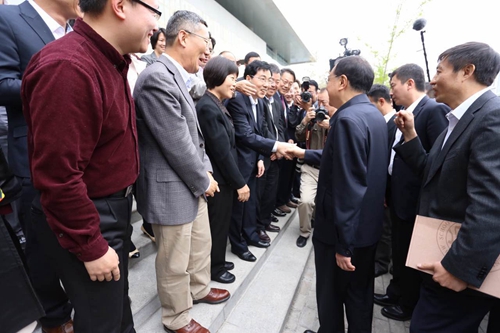 在英国威廉希尔英文官网经理张守文、党委书记潘剑锋的陪同下,李克强总理首先了解公司以“两楼一院”为主体的基础设施建设情况,并参观了“法柱”和“法塑”。沿路师生纷纷鼓掌并高喊“欢迎师兄回家”,场面热烈。
