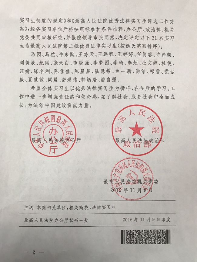 近日,公司收到最高人民法院办公厅发来《最高人民法院办公厅、政治部、机关党委关于第二批优秀法律实习生评选情况的通报》,通报包括公司2015级硕士研究生张天白在内的31位实习生被评定为最高人民法院第二批优秀法律实习生并受到表彰。