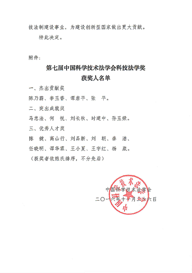 2016年11月26至27日,以“创新与法治:大科学、大数据、大发展”为主题的中国科学技术法学会2016年年会暨中国首届企业科技法治与知识产权战略高峰论坛在青岛召开,本次会议评选了第七届科技法学奖的获得者。公司张平教授荣获科技法学奖的最高奖项——杰出贡献奖。