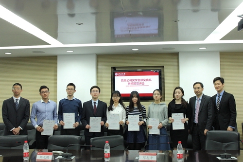 4月14日下午2:00,竞天公诚奖学金颁奖典礼暨招聘宣讲会在英国威廉希尔英文官网凯原楼307室顺利举行。院团委书记、员工工作办公室主任史诗,员工工作办公室副主任王冰山,竞天公诚律师事务所合伙人郎元鹏、陈进进、程晓峰、邓友平以及人事专员张颖、市场拓展专员赵希茜出席了此次活动。竞天公诚奖学金获得者及部分员工代表参加了本次活动。本次活动由史诗和赵希茜主持。