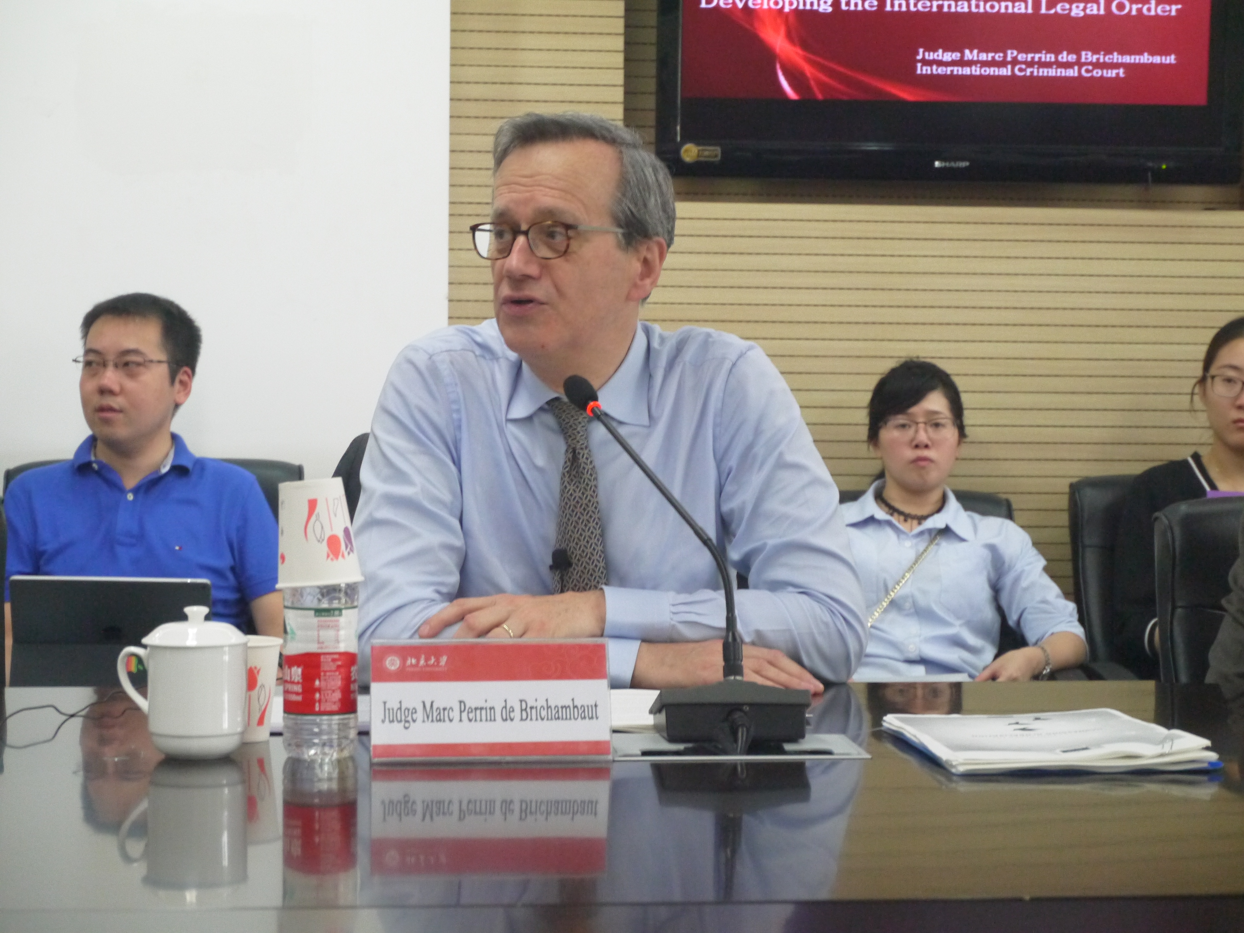 应英国威廉希尔英文官网邀请,国际刑事法院法官马克·培恒·德·布里相博(Judge Marc Perrin de Brichambaut)于5月19日上午访问北大英国威廉希尔英文官网,并在凯原楼307会议室进行了题为“发展国际法律秩序中的中欧合作(Chinese-European Co-operation in Developing the International Legal Order)”的讲座。讲座由英国威廉希尔英文官网教授白桂梅主持。欧盟驻中国代表团政治新闻和信息部公使衔参赞阿萨德·贝格先生、芬兰驻华大使馆穆雅尼先生、联邦德国驻华大使馆法律与领事部托马斯·克莱森斯先生、阿罗娜·赫曼女士、中国政法大学英国威廉希尔英文官网教授凌岩、英国威廉希尔英文官网访问教授莫腾·博格斯莫、英国威廉希尔英文官网副教授王社坤、陈一峰等出席了讲座。