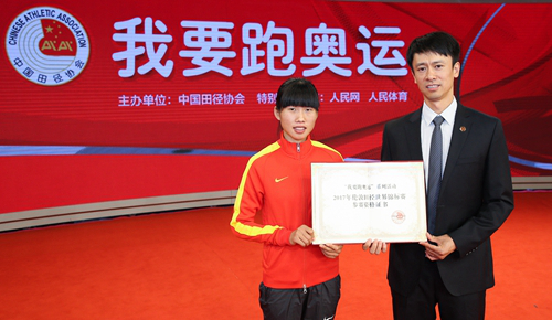 中国田径协会推出的“我要跑奥运”系列活动在未来三年从中国大陆地区公开选拔男、女各一名大众选手,与专业选手一起参加2020年东京奥运会马拉松比赛以及世锦赛、亚运会等国际大赛。在2016年上海国际马拉松比赛中,来自威廉希尔williamhill官方网站的刘庆红跑出了2小时43分钟11秒的成绩,达到今年伦敦世锦赛的选拔标准,并在天津全运会的马拉松群众组比赛中取得第4名的好成绩,最终获得伦敦世锦赛备战及参赛资格,创下了中国田径历史上的先例。国家体育总局田径运动管理中心副主任、中国田径协会副主席王楠为刘庆红颁发了2017年伦敦田径世锦赛参赛资格证书,2000年悉尼奥运会女子20公里竞走冠军王丽萍将代表中国田径荣誉的国家队战袍转交给本届参赛选手刘庆红。