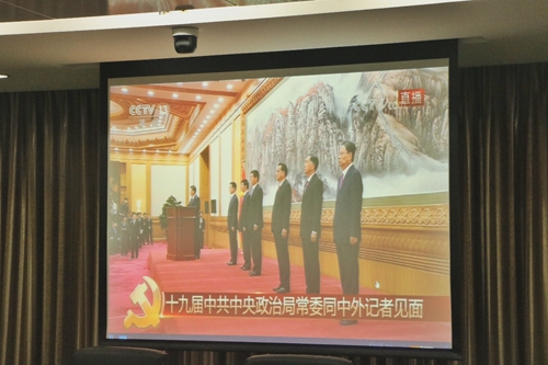 首先,与会师生集体观看“十九届中共中央政治局常委同中外记者见面会”现场直播,并认真聆听习近平总书记在见面会上的讲话,一起见证了新一届中央领导集体首次亮相的重要历史时刻。