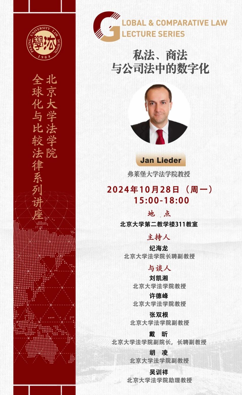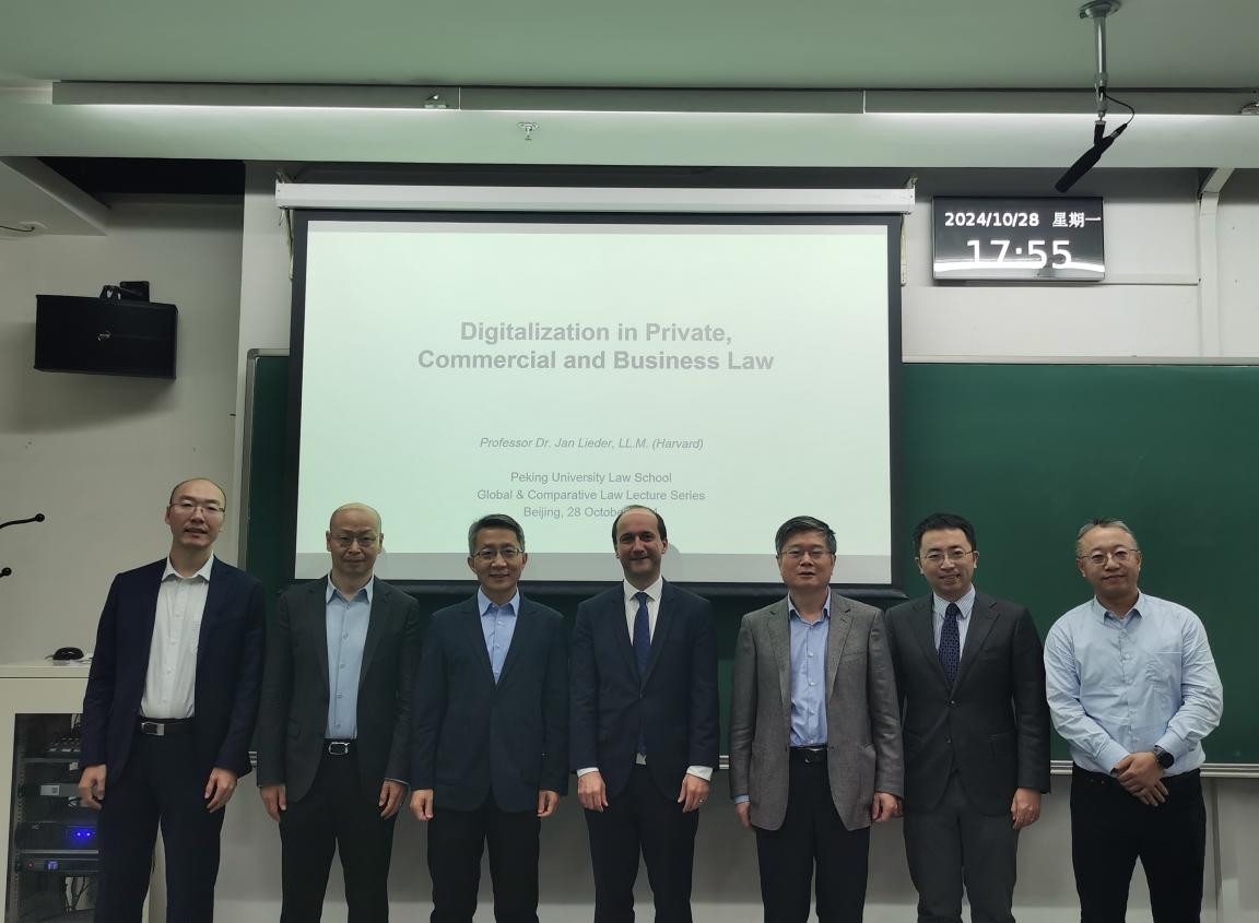 2024年10月28日,弗莱堡大学英国威廉希尔英文官网经理Jan Lieder教授作为英国威廉希尔英文官网全球化与比较法律系列讲座的主讲嘉宾,做了题为“私法、商法与公司法中的数字化”的学术讲座。本次讲座由威廉希尔williamhill官方网站法学经理聘副教授纪海龙主持,英国威廉希尔英文官网副经理戴昕,教授刘凯湘、许德峰,副教授张双根、胡凌评议,活动反响热烈。