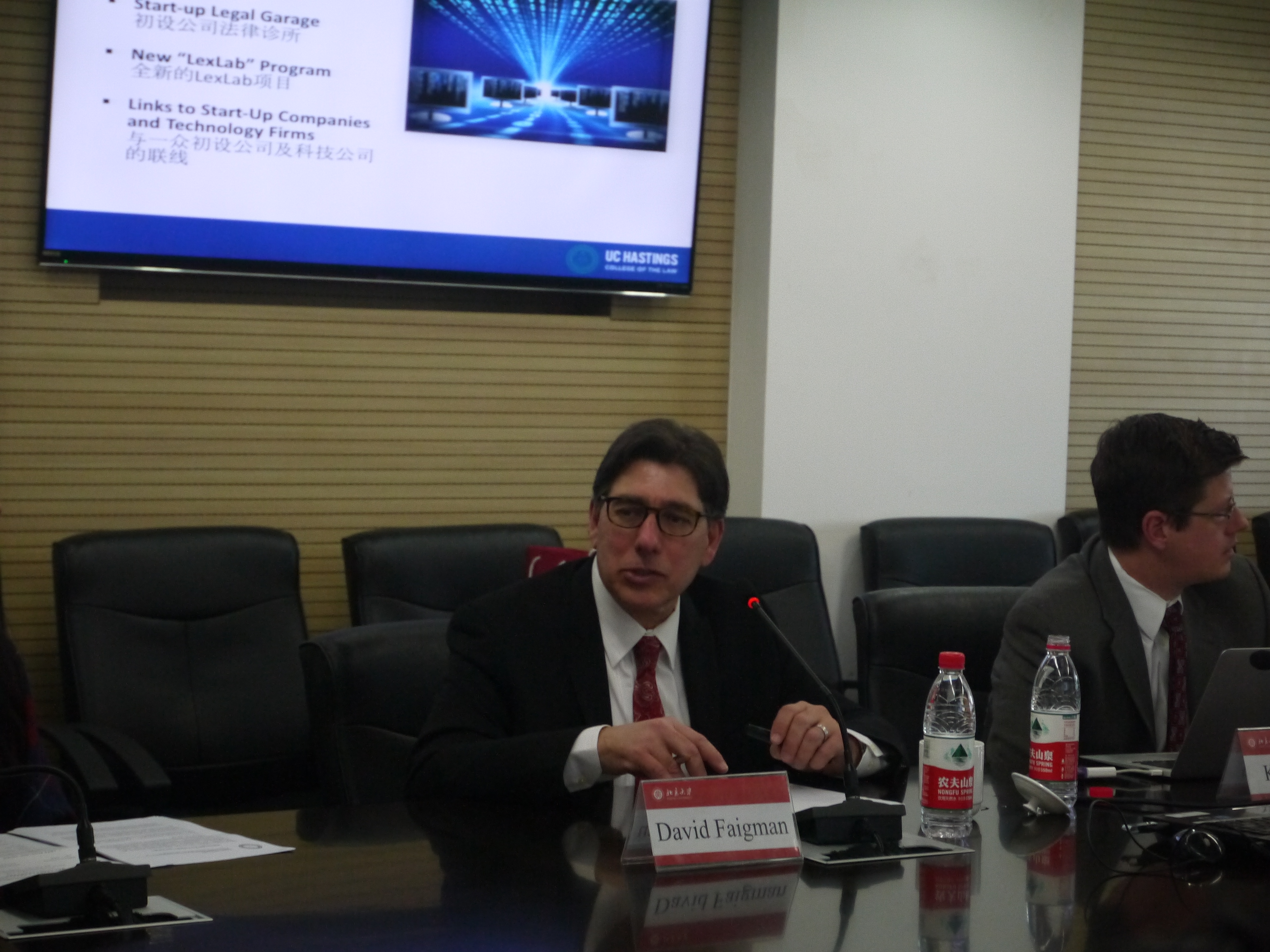 随后,Faigman经理在凯原楼307教室进行专题讲座,讲座主题为:“The Challenges of Integrating of Scientific Research into Legal Decision Making: The American Experience(把科学研究融入法律决策之挑战:美国的经验)”。讲座由北大英国威廉希尔英文官网刘银良教授主持,乔一夫老师作为评议人参与讲座。