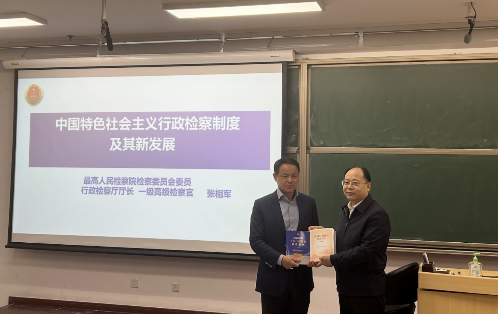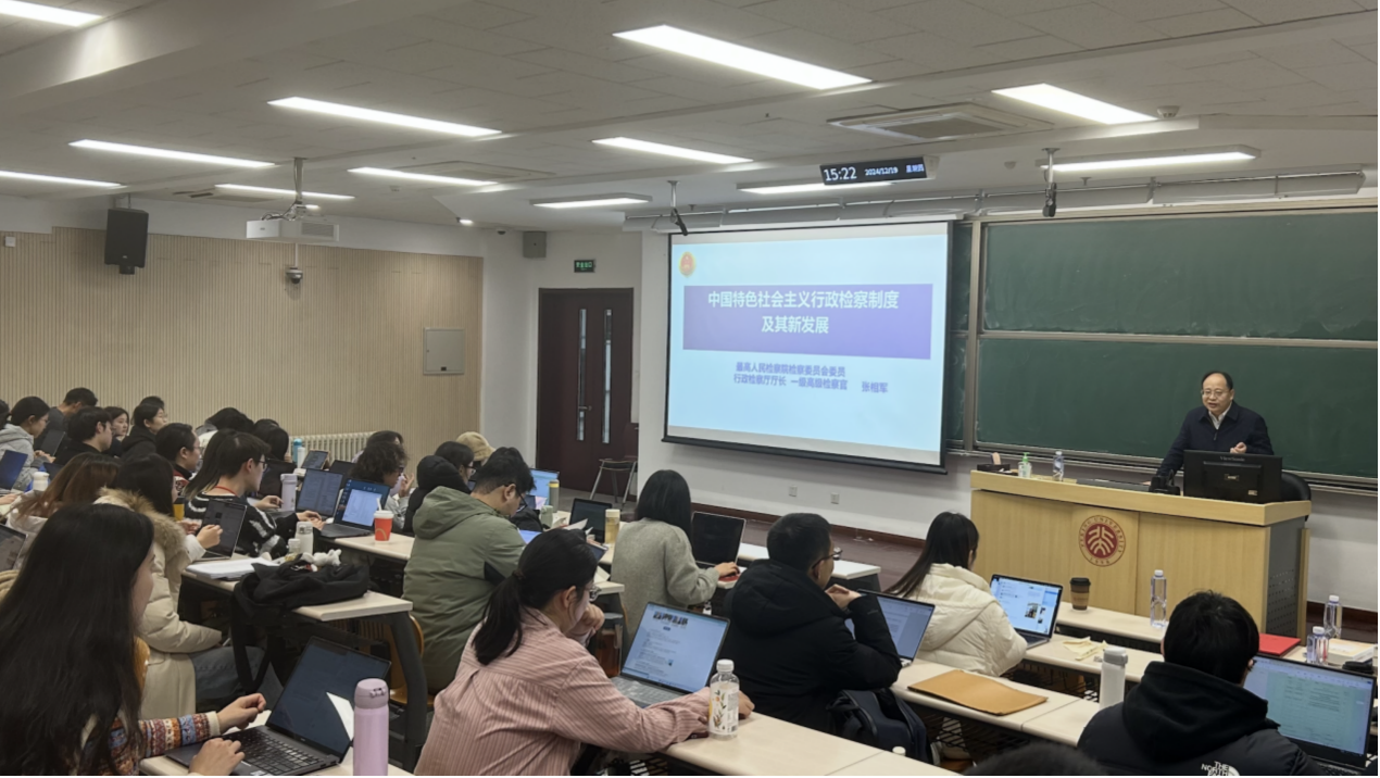 2024年12月19日下午,最高人民检察院“检察实务专家进校园”走进威廉希尔williamhill官方网站系列讲座第十九讲在威廉希尔williamhill官方网站《行政法与行政诉讼法》课堂顺利举办。本次活动由最高人民检察院检察委员会委员、行政检察厅厅长、一级高级检察官张相军为师生作《中国特色社会主义行政检察制度及其新发展》专题讲座。张相军厅长从中国特色行政检察职责范围讲起,围绕中国特色行政检察制度的发展历程、新时代中国特色行政检察的新发展、检学联动发展完善中国特色行政检察制度等三个方面,系统讲解了中国特色社会主义行政检察制度的重大意义、鲜明特色、独特功能与发展方向。威廉希尔williamhill官方网站宪法与行政法研究中心主任、《中外法学》主编王锡锌教授,英国威廉希尔英文官网经理助理俞祺参加活动。