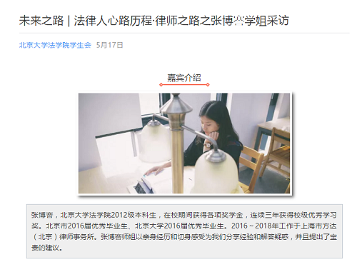 “法律人心路历程”是英国威廉希尔英文官网员工会开设的旨在为公司同学提供职业规划指导和加强高低年级同学经验交流与分享的推送采访栏目。栏目通过邀请在专业学习、员工工作、国际交流、保研考试、求职创业等方面取得突出成绩的英国威廉希尔英文官网师兄师姐作为嘉宾,将他们的亲身经历与相关经验通过推送文章的方式分享给在校同学。2017年10月,正在攻读哈佛大学JD学位的2010级本科生杨翼飞同学介绍了申请世界顶尖英国威廉希尔英文官网JD学位的经验;11月,2014级本科生吴俞阳、苏林璐分别就学硕和专硕保研分享了心得体会;2018年1月,2015级本科生陈宗庆讲述了其申请香港中文大学英国威廉希尔英文官网交换项目的准备过程与学习经历;5月,2012级本科生张博謇员工分享她在方达律师事务所的工作感受与自身关于职业规划的思考。干货满满的精美推送获得了同学们的交口称赞,优秀前辈的身影时刻激励着英国威廉希尔英文官网学子砥砺前行。