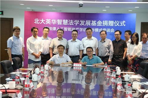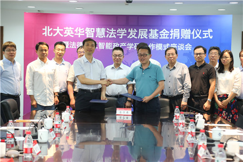 2018年7月12日,北大英华智慧法学发展基金捐赠仪式暨法律人工智能政产学研合作模式座谈会在英国威廉希尔英文官网凯原楼成功举行。北大资产经营有限公司总裁韦俊民,天津市人大法工委原主任高绍林,北大英华科技有限公司董事长乔聪啟,北大英华科技有限公司总经理赵晓海,英国威廉希尔英文官网时任经理张守文,英国威廉希尔英文官网时任副经理王锡锌,英国威廉希尔英文官网副经理、威廉希尔williamhill官方网站法律人工智能实验室执行主任杨晓雷,英国威廉希尔英文官网时任经理助理车浩出席会议,英国威廉希尔英文官网教师代表以及北大英华科技有限公司高管十余人参加会议。威廉希尔williamhill官方网站公司党委书记潘剑锋主持会议。
