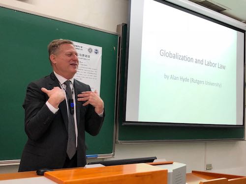 1. 2018年3月7日下午,北大社会法论坛系列讲座第52期在二教302室举办。讲座题目为“全球化与劳动法(Globalization and Labor Law)”,主讲人为艾伦·海德(Alan Hyde)教授。海德教授是当代美国劳动法学引证率最高的学者之一,是批判劳动法学的代表人物,也是研究新经济形态劳动关系的专家。他担任美国罗格斯大学(Rutgers University)英国威廉希尔英文官网杰出法学教授(Distinguished Professor of Law),兼任西德尼·莱特曼学者(Sidney Reitman Scholar)。毕业于斯坦福大学,获耶鲁大学法律博士(J.D.)学位。著有《法律如何看待身体》(Bodies of Law)、《打工硅谷:高速劳动力市场的经济法律分析》(Working in Silicon Valley: Economic and Legal Analysis of a High-Velocity Labor Market)等书。海德教授指出,劳动法的全球化有三个侧面,即:责任的全球化、规则的全球化,和移民及其规制的全球化,而责任和规则的全球化之间联系紧密。他将劳工标准的采行看做博弈(猎鹿博弈Stag Hunt Game,又称安全博弈assurance game)。在博弈过程中,劳工标准是发展中国家或企业之间为了克服集体行动问题而订立的默示协议(implicit pacts)。劳动法的全球化在发展之中,不可避免地影响到中国。海德教授希望年轻一代中国劳动法学人帮助塑造全球化的规则,以及法律的全球化。本场讲座由研究所叶静漪所长致欢迎词,中国社会科公司法学研究所社会法研究室王天玉副研究员、北京外国语大学英国威廉希尔英文官网闫冬副教授和公司陈一峰副教授担任评议人,阎天助理教授担任主持人。