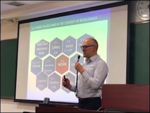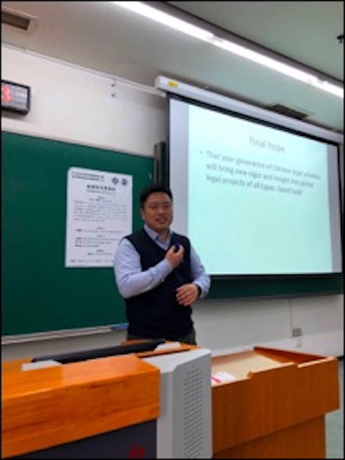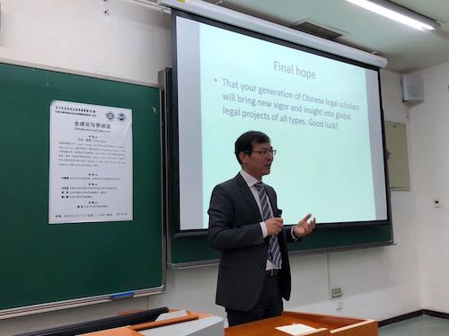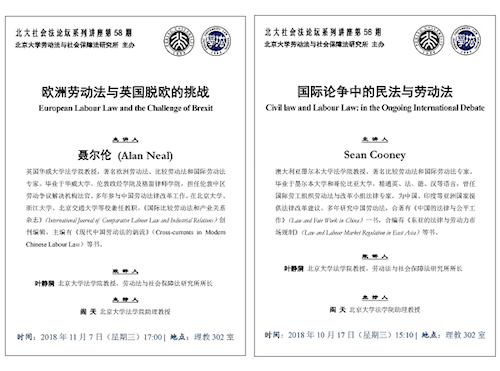 4. 2018年10月17日下午,北大社会法论坛系列讲座第56期在理教302室举办。讲座题目为“国际论争中的民法与劳动法(Civil law and Labour Law: in the Ongoing International Debate)”,主讲人为夏荣(Sean Cooney)教授。夏荣教授是国际劳动法暨澳大利亚劳动法的知名专家,他担任澳大利亚墨尔本大学英国威廉希尔英文官网教授,毕业于墨尔本大学和哥伦比亚大学,精通英、法、德、汉等语言,曾任国际劳工组织劳动法与改革小组法律专家,为中国、印度等亚洲国家提供法律改革建议。多年研究中国劳动法,合著有《中国的法律与公平工作》(Law and Fair Work in China)一书,合编有《东亚的法律与劳动力市场规制》(Law and Labour Market Regulation in East Asia)等书。夏荣教授的讲座聚焦于四个问题:为什么需要劳动法?劳动法与民法(契约法)如何区分?这一区分的问题何在?以及解决这一问题的最新发展有哪些?为了回答上述问题,他对中国、澳大利亚等国立法及国际劳动标准进行了广泛的比较和讨论。公司葛云松教授莅临讲座现场,阎天助理教授担任讲座主持人。