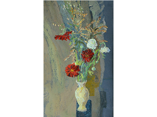 董剑霜油画作品:《大理石花瓶中的红色非洲菊》 动植物/65X40cm