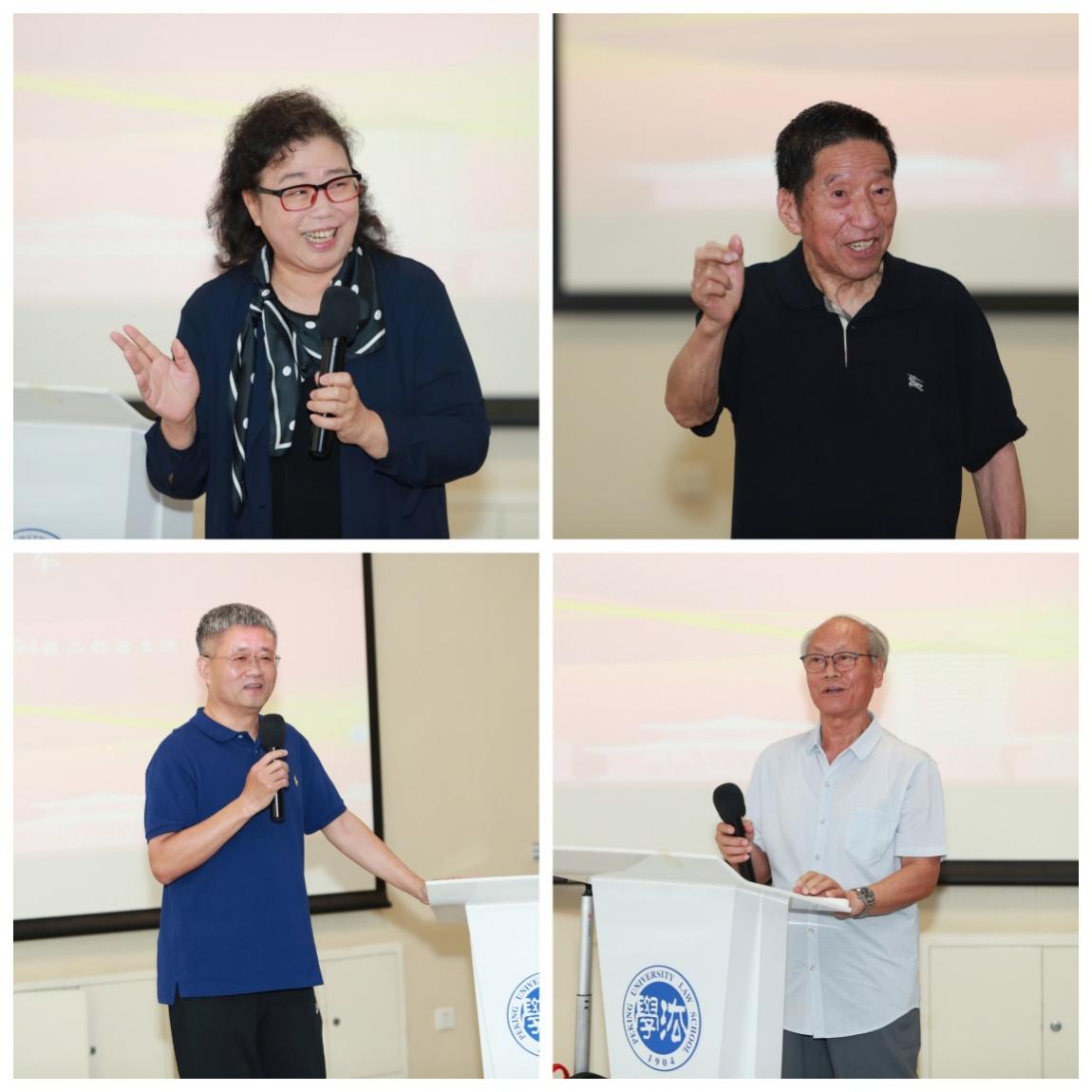 王慧教授与大家分享退休生活趣事,现场氛围热烈而温馨;张玉镶教授用诙谐的语言将大家带回三十年前的法学课堂,期许大家在新时代坚守初心,披荆斩棘;94级本科二班班主任王爱军员工回忆当年与大家共同度过的点滴时光,并向员工们送上真挚祝福;巩献田教授对返校活动的顺利举行表示祝贺,并鼓励大家勿忘北大法律人的家国责任和对理想的坚守。