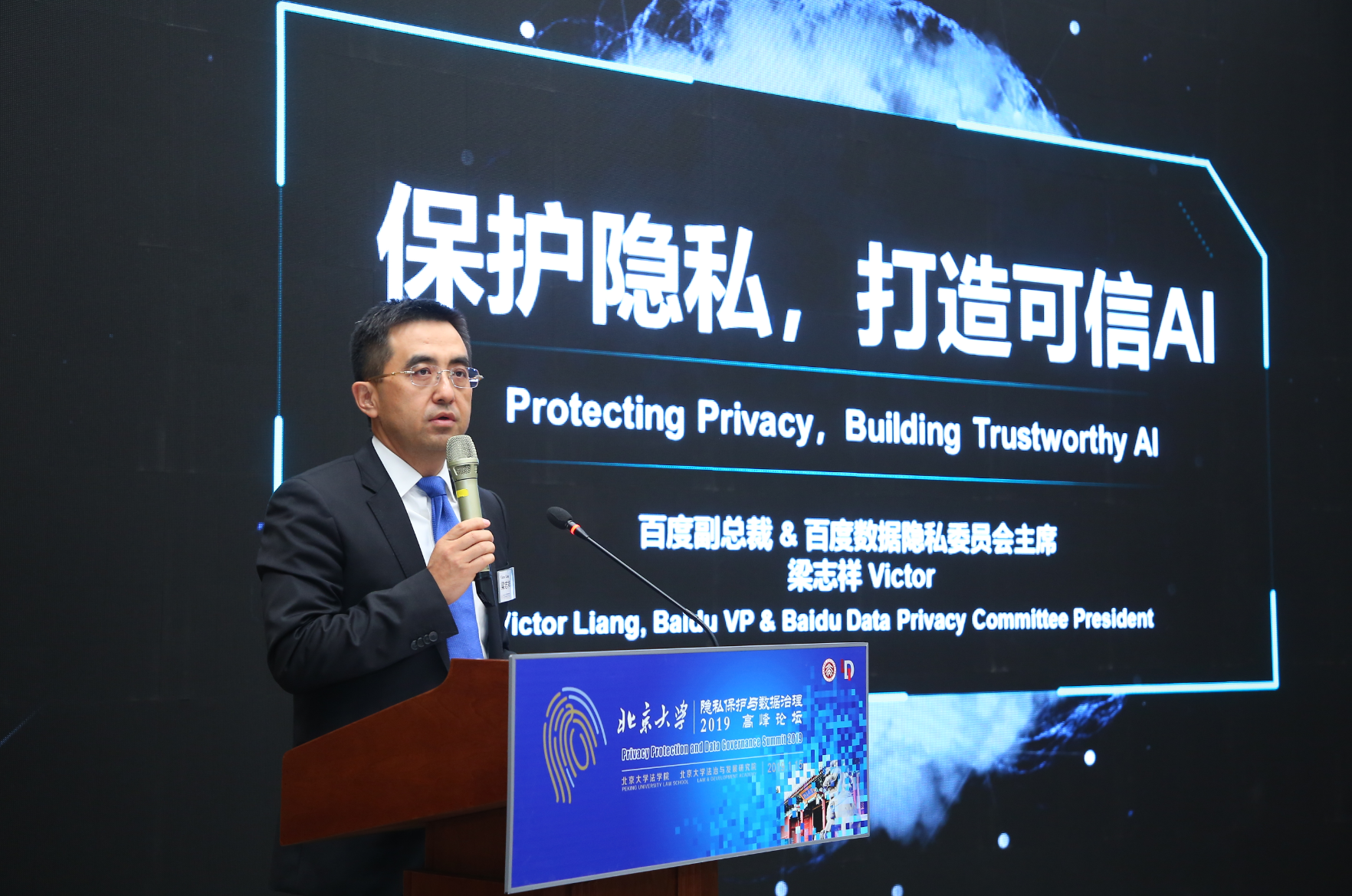 首先,百度公司副总裁、百度数据隐私保护委员会主席梁志祥发表了题为“保护隐私,打造可信的AI”的主旨演讲。他指出,从全球范围看,2018年对于个人信息保护具有划时代的意义,全球在数据隐私方面发生了诸多事件并采取了一定的措施。在介绍百度公司在个人信息保护方面的实践时,他指出,百度致力于“保护隐私,打造可信AI”,并将个人隐私保护视为AI时代的最强竞争力, 为此专门设立了数据隐私保护委员会,所有成员都是百度公司管理层成员,他本人担任主席。同时,他表示,百度建立了清晰的数据隐私价值观和原则,即三C原则:第一、充分尊重用户,取得用户的同意(Consent);第二、亲近用户,让用户可以清晰地了解隐私政策(Clarity);第三、赋能用户,提升用户的参与度,给予用户对其个人信息利用有意义的控制(Control)。为了确保所有的数据处理行为都能周全地保护隐私,百度有四个方面的实践,分别是隐私保护制度建设、隐私保护流程性要求、隐私保护技术储备和隐私保护在产品中的落地。